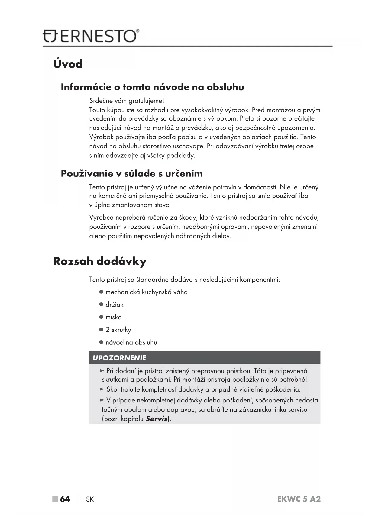 SK Úvod Informácie o tomto návode na obsluhu Srdečne vám gratulujeme! Touto kúpou ste sa rozhodli pre vysokokvalitný výrobok. Pred montážou aprvým uvedením do prevádzky sa oboznámte svýrobkom. Preto si pozorne prečítajte nasledujúci návod na montáž a prevádzku, ako ajbezpečnostné upozornenia. Výrobok používajte iba podľa popisu avuvedených oblastiach použitia. Tento návod na obsluhu starostlivo uschovajte. Pri odovzdávaní výrobku tretej osobe sním odovzdajte aj všetky podklady. Používanie vsúlade surčením Tento prístroj je určený výlučne na váženie potravín vdomácnosti. Nie je určený na komerčné ani priemyselné používanie. Tento prístroj sa smie používať iba v úplne zmontovanom stave. Výrobca nepreberá ručenie za škody, ktoré vzniknú nedodržaním tohto návodu, používaním v rozpore s určením, neodbornými opravami, nepovolenými zmenami alebo použitím nepovolených náhradných dielov. Rozsah dodávky Tento prístroj sa štandardne dodáva snasledujúcimi komponentmi: ▯ mechanická kuchynská váha ▯ držiak ▯ miska ▯ 2 skrutky ▯ návod naobsluhu UPOZORNENIE ► Pri dodaní je prístroj zaistený prepravnou poistkou. Táto je pripevnená skrutkami a podložkami. Pri montáži prístroja podložky nie sú potrebné! ► Skontrolujte kompletnosť dodávky aprípadné viditeľné poškodenia. ► Vprípade nekompletnej dodávky alebo poškodení, spôsobených nedosta- točným obalom alebo dopravou, sa obráťte na zákaznícku linku servisu (pozri kapitolu Servis