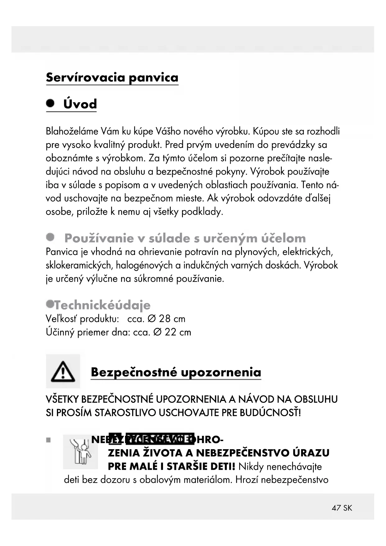 PRE MALÉ I STARŠIE DETI! Nikdy nenechávajte deti bez dozoru s obalovým materiálom. Hrozí nebezpečenstvo48 SK udusenia obalovým materiálom. Deti často podceňujú nebezpe- čenstvá. Obalový materiál držte vždy mimo dosahu detí. NEBEZPEČENSTVO PORANENIA! Myslite na to, že rukoväte môžu byť pri varení horúce. Ako ochranu preto používajte kuchynské alebo grilovacie rukavice. Pokrývku nepoužívajte, ak je hmat uvoľnený. Panvicu v žiadnom prípade nepoužívajte, ak sú rukoväte uvoľnené. V prípade potreby dotiahnite skrutky rukovätí.