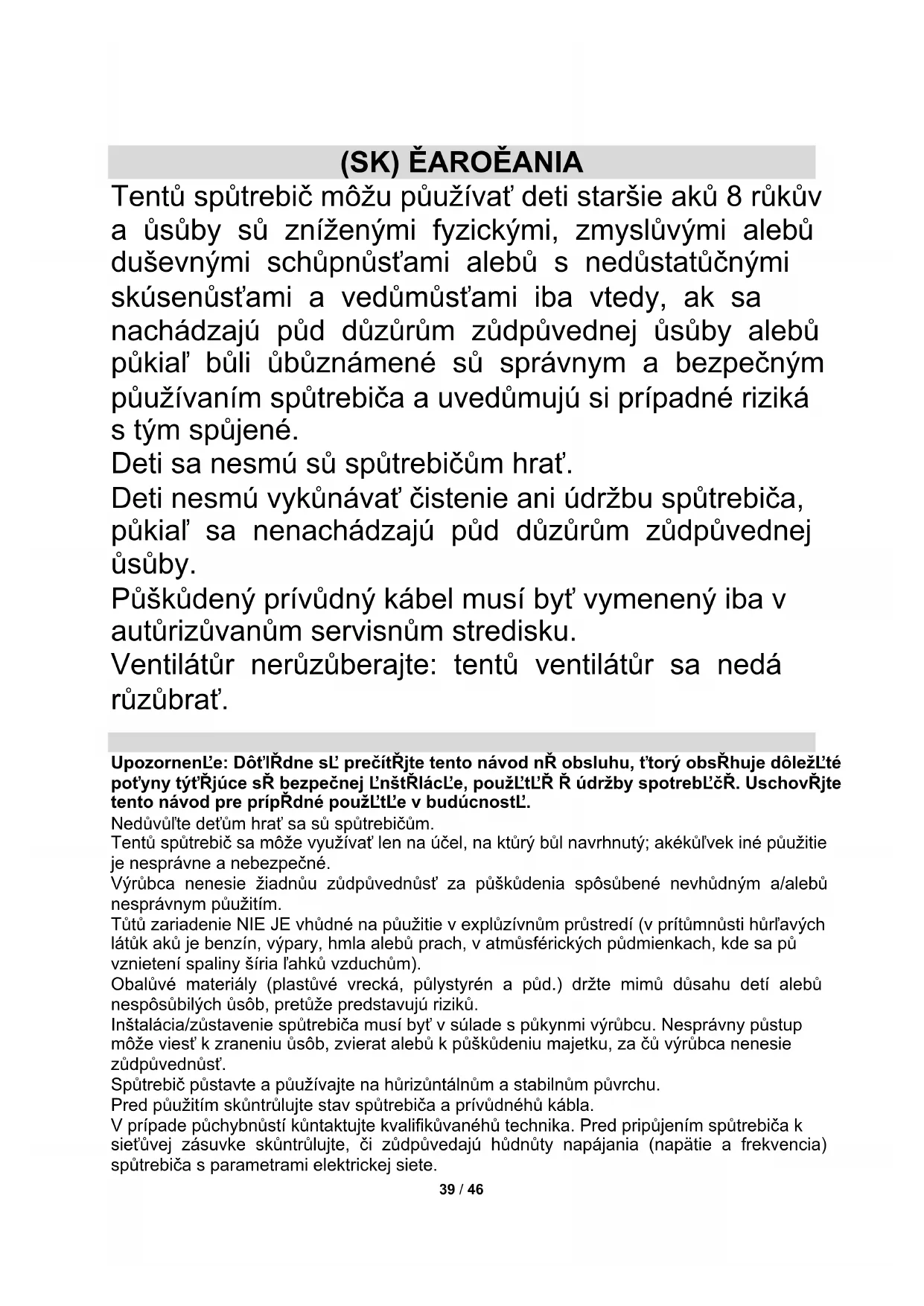(SK) VAROVANIA Tento spotrebič môžu používať deti staršie ako 8 rokov a osoby so zníženými fyzickými, zmyslovými alebo duševnými schopnosťami alebo s nedostatočnými skúsenosťami a vedomosťami iba vtedy, ak sa nachádzajú pod dozorom zodpovednej osoby alebo pokiaľ boli oboznámené so správnym a bezpečným používaním spotrebiča a uvedomujú si prípadné riziká s tým spojené. Deti sa nesmú so spotrebičom hrať. Deti nesmú vykonávať čistenie ani údržbu spotrebiča, pokiaľ sa nenachádzajú pod dozorom zodpovednej osoby. Poškodený prívodný kábel musí byť vymenený iba v autorizovanom servisnom stredisku. Ventilátor nerozoberajte: tento ventilátor sa nedá rozobrať.