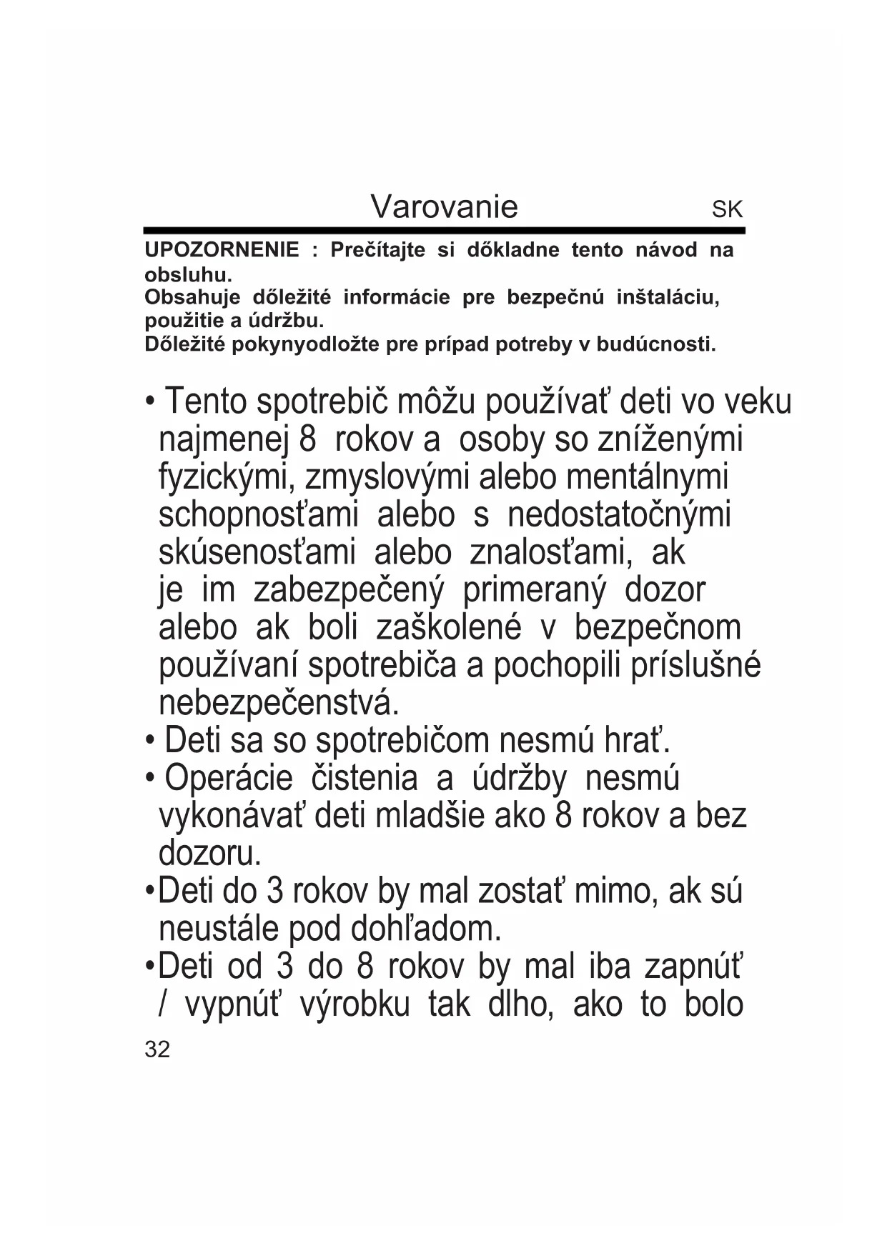 - Deti od 3 do 8 rokov by nemali ho pripojte, upraviť alebo čistenie spotrebiča alebo vykonať bežnú údržbu.