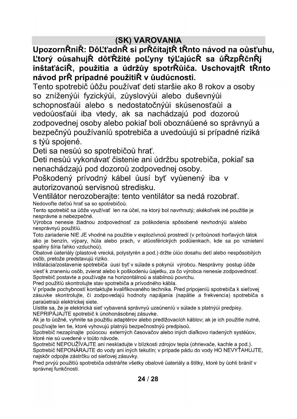 Pred čistením zariadenia vytiahnite zástrčku napájacieho kábla zo zásuvky. Ventilátor nerozoberajte: tento ventilátor sa nedá rozobrať. Na vonkajšie čistenie používajte mäkkú a suchú utierku. NEPONÁRAJTE zariadenie do vody, ani naň nestriekajte žiadne tekutiny. Na čistenie NEPOUŽÍVAJTE rozpúšťadlá ani iné chemické látky. Ak ventilátor nebudete dlhší čas používať, po vyčistení ho skladujte na suchom mieste. (SK) INFORMÁCIE PRE POUŽÍVATEĽOV BALENIE V záujme ochrany životného prostredia je potrebné obalový materiál riadne zlikvidovať v súlade so separovaným zberom. Skontrolujte miestne predpisy. „Smernica 2012/19/EU o starých elektrických a elektronických zariadeniach (OEEZ)“ Tento symbol na produktoch a/alebo na priložených dokumentoch znamená, že sa pri likvidácii nesmú elektrické a elektronické zariadenia miešať so všeobecným domácim odpadom. V záujme správneho obhospodarovania, obnovy a recyklácie odvezte, prosím, tieto produkty na určené zberné miesta, kde budú prijaté bez poplatku. V niektorých krajinách je možné tieto produkty vrátiť priamo miestnemu maloobchodu v prípade, ak si objednáte podobný nový výrobok. Správna likvidácia týchto produktov pomôže ušetriť hodnotné zdroje a zabrániť možným negatívnym vplyvom na ľudské zdravie a prostredie, ktoré môžu inak vzniknúť v dôsledku nesprávneho zaobchádzania s odpadom. Bližšie informácie o najbližšom zbernom mieste získate na miestnom úrade. V prípade nesprávnej likvidácie odpadu môžu byť uplatnené pokuty v súlade s platnou legislatívou. Pre právnické osoby v Európskej únii Ak potrebujete zlikvidovať opotrebované elektrické a elektronické zariadenia, bližšie informácie získate od svojho miestneho predajcu alebo dodávateľa. Informácie o likvidácii v krajinách mimo Európskej únie Tento symbol je platný len v Európskej únii. Ak si želáte zlikvidovať toto zariadenie, obráťte sa na miestny úrad alebo predajcu a poinformujte sa o správnom spôsobe likvidácie tohto typu odpadu.27 / 28