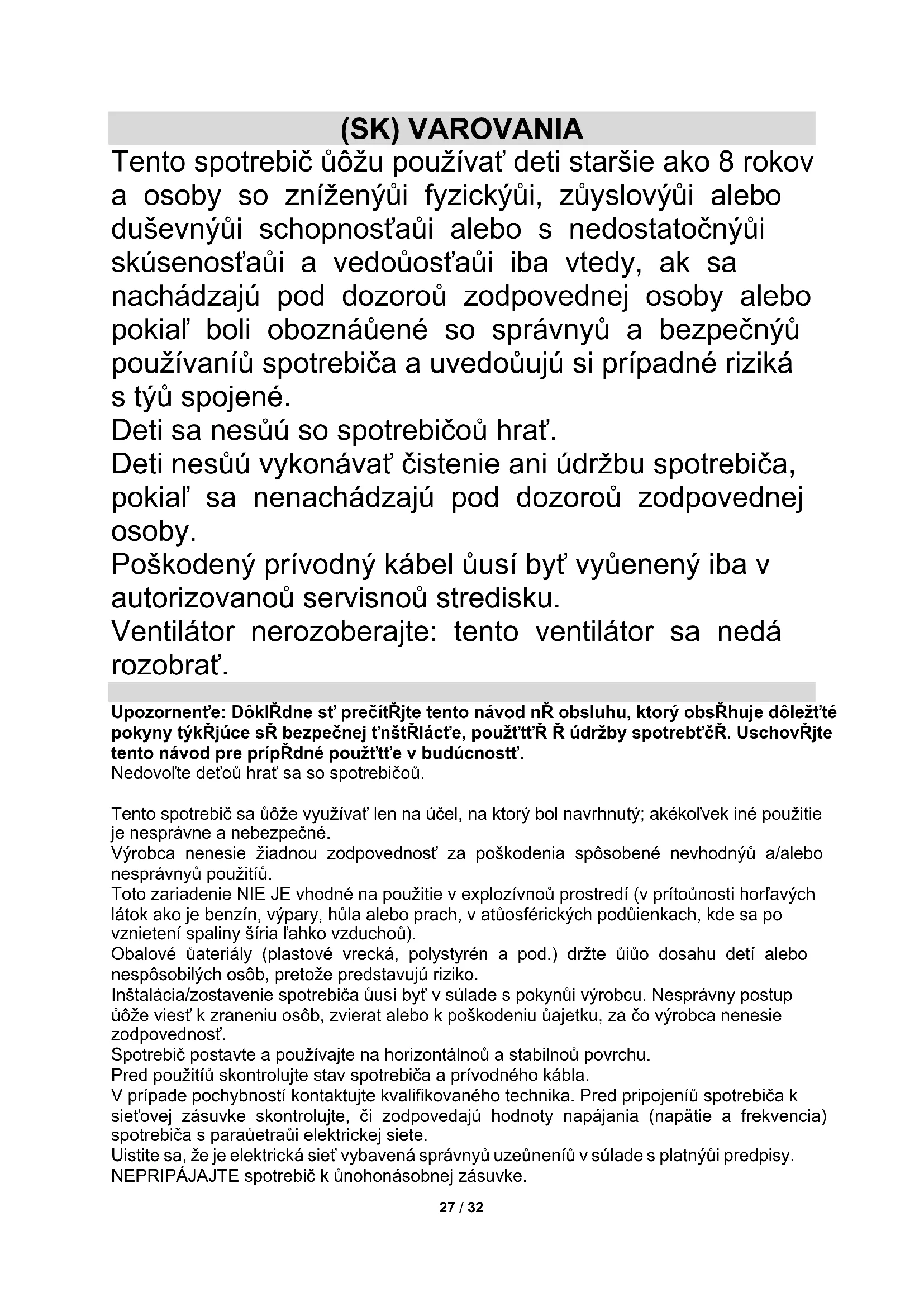 ČERTES spol. s r.o. Donínská 83 463 34 Hrádek nad Nisou Tel./fax 482771487 - příjem oprav- servis. Tel./fax 482718718 - náhradní díly Mobil: 721018073, 731521116, 608719174 Pracovní doba 8 - 16,30 www: certes.info, e-mail: certes@certes.info Distributor PRIVEST s.r.o. Na Zlatnici 301/2 Praha 4, PSČ 147 00 www: www.privest.cz Email: info@privest.cz Telefon: (+420) 241 410 81927 / 32 (SK) VAROVANIA Tento spotrebič môžu používať deti staršie ako 8 rokov a osoby so zníženými fyzickými, zmyslovými alebo duševnými schopnosťami alebo s nedostatočnými skúsenosťami a vedomosťami iba vtedy, ak sa nachádzajú pod dozorom zodpovednej osoby alebo pokiaľ boli oboznámené so správnym a bezpečným používaním spotrebiča a uvedomujú si prípadné riziká s tým spojené. Deti sa nesmú so spotrebičom hrať. Deti nesmú vykonávať čistenie ani údržbu spotrebiča, pokiaľ sa nenachádzajú pod dozorom zodpovednej osoby. Poškodený prívodný kábel musí byť vymenený iba v autorizovanom servisnom stredisku. Ventilátor nerozoberajte: tento ventilátor sa nedá rozobrať. Upozornenie: Dôkladne si prečítajte tento návod na obsluhu, ktorý obsahuje dôležité pokyny týkajúce sa bezpečnej inštalácie, použitia a údržby spotrebiča. Uschovajte tento návod pre prípadné použitie v budúcnosti. Nedovoľte deťom hrať sa so spotrebičom. Tento spotrebič sa môže využívať len na účel, na ktorý bol navrhnutý; akékoľvek iné použitie je nesprávne a nebezpečné. Výrobca nenesie žiadnou zodpovednosť za poškodenia spôsobené nevhodným a/alebo nesprávnym použitím. Toto zariadenie NIE JE vhodné na použitie v explozívnom prostredí (v prítomnosti horľavých látok ako je benzín, výpary, hmla alebo prach, v atmosférických podmienkach, kde sa po vznietení spaliny šíria ľahko vzduchom). Obalové materiály (plastové vrecká, polystyrén a pod.) držte mimo dosahu detí alebo nespôsobilých osôb, pretože predstavujú riziko. Inštalácia/zostavenie spotrebiča musí byť v súlade s pokynmi výrobcu. Nesprávny postup môže viesť k zraneniu osôb, zvierat alebo k poškodeniu majetku, za čo výrobca nenesie zodpovednosť. Spotrebič postavte a používajte na horizontálnom a stabilnom povrchu. Pred použitím skontrolujte stav spotrebiča a prívodného kábla. V prípade pochybností kontaktujte kvalifikovaného technika. Pred pripojením spotrebiča k sieťovej zásuvke skontrolujte, či zodpovedajú hodnoty napájania (napätie a frekvencia) spotrebiča s parametrami elektrickej siete. Uistite sa, že je elektrická sieť vybavená správnym uzemnením v súlade s platnými predpisy. NEPRIPÁJAJTE spotrebič k mnohonásobnej zásuvke.28 / 32 Ak je to možné, vyhnite sa použitiu adaptérov alebo predlžovacích káblov; ak je ich použitie nutné, používajte len tie, ktoré vyhovujú platným bezpečnostným predpisom. Spotrebič nezapínajte pomocou externých časovačov alebo iných diaľkovo riadených systémov, ktoré nie sú uvedené v tomto návode. Spotrebič NEPOUŽÍVAJTE ani neskladujte v blízkosti zdrojov tepla (ohrievače, kachle a pod.). Spotrebič NEPONÁRAJTE do vody ani iných tekutín; v prípade pádu do vody HO NEVYŤAHUJTE, najskôr odpojte zástrčku od sieťovej zásuvky. Pred prvým použitím spotrebiča odstráňte všetky obalové materiály a štítky, ktoré by mohli brániť v správnej funkčnosti. Kábel pripájajte a odpájajte len suchými rukami. Pred pripojením sa uistite, že je tlačidlo zapnutia na spotrebiči v pozícii „OFF“ (vypnuté). Po použití odpojte zástrčku, aby ste zabránili prehriatiu (na prenášanie spotrebiča nepoužívajte kábel). Prívodný kábel neveďte cez ostré ani drsné plochy a v miestach, kde sa môže ľahko poškodiť. NEBLOKUJTE ani čiastočne vstup a výstup vzduchu a do spotrebiča nevkladajte cudzie predmety. Počas prevádzky sa nedotýkajte spotrebiča mokrými časťami tela a v každom prípade odporúčame použitie izolačného materiálu medzi vami a podlahou (napríklad obuv s gumovou podrážkou). Počas použitia udržiavajte spotrebič v bezpečnej vzdialenosti od predmetov a prípadne horľavých látok. V prípade poruchy alebo neštandardnej prevádzky spotrebiča ho ihneď vypnite, odpojte od elektrickej siete a skontrolujte príčinu poruchy, ak je to možné, s pomocou kvalifikovanej osoby. Nevykonávajte žiadne činnosti, ktoré nie sú popísané v tomto návode (napríklad demontáž spotrebiča). Pred čistením, uskladnením, vykonávaním údržby alebo ak nebudete spotrebič používať dlhší čas, odpojte ho od elektrickej siete. Spotrebič používajte a skladujte len vo vnútri alebo ho chráňte pred slnkom, dažďom a prachom. Spotrebič nie je určený na použitie a skladovanie vonku. Čistenie a údržbu spotrebiča NESMÚ vykonávať deti bez dozoru dospelej osoby. Pred odpojením spotrebiča ho vypnite pomocou príslušného príkazu alebo tlačidla na ovládacom paneli. NEVEŠAJTE ventilátor na stenu a strop, ak nie je tento typ inštalácie povolený výrobcom. Spotrebič postavte do správnej vzdialenosti od predmetov alebo okolitých stien tak, aby jeho funkcia nespôsobila poškodenie. Spotrebič NEPOUŽÍVAJTE v blízkosti plynových sporákov alebo zdroja otvoreného ohňa. Spotrebič NEPOUŽÍVAJTE v blízkosti záclon a textílií. Spotrebič počas prevádzky NEZAKRÝVAJTE. Cez mriežku spotrebiča NEVKLADAJTE žiadne cudzie predmety. Spotrebič počas prevádzky NENECHÁVAJTE dlhý čas bez dozoru. NEVYSTAVUJTE sa na dlhý čas prúdeniu vzduchu z ventilátora, môže to mať negatívny vplyv na vaše zdravie. Ak nebudete spotrebič dlhší čas používať, uložte ho do originálneho obalu na suchom mieste. Pred prvým použitím alebo po dlhodobom odstavení skontrolujte, či je ventilátor čistý a lopatky ventilátora sa voľne otáčajú (pri odpojenom napájaní).29 / 32