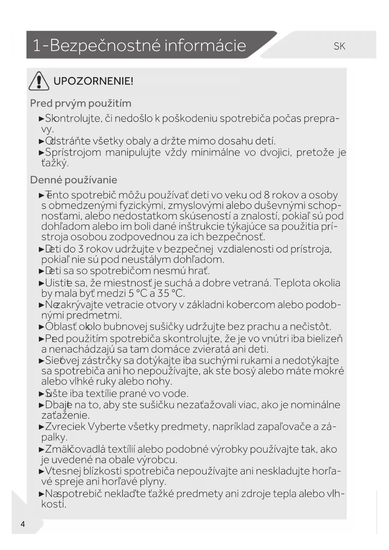 UPOZORNENIE! Pred prvým použitím ▶ Sk ontrolujte, či nedošlo k poškodeniu spotrebiča počas prepra- vy. ▶ O dstráňte všetky obaly a držte mimo dosahu detí. ▶ S prístrojom manipulujte vždy minimálne vo dvojici, pretože je ťažký. Denné používanie ▶ T ento spotrebič môžu používať deti vo veku od 8 rokov a osoby s obmedzenými fyzickými, zmyslovými alebo duševnými schop- nosťami, alebo nedostatkom skúseností a znalostí, pokiaľ sú pod dohľadom alebo im boli dané inštrukcie týkajúce sa použitia prí- stroja osobou zodpovednou za ich bezpečnosť. ▶ D eti do 3 rokov udržujte v bezpečnej vzdialenosti od prístroja, pokiaľ nie sú pod neustálym dohľadom. ▶ D eti sa so spotrebičom nesmú hrať. ▶ Uistit e sa, že miestnosť je suchá a dobre vetraná. Teplota okolia by mala byť medzi 5 °C a 35 °C. ▶ Ne zakrývajte vetracie otvory v základni kobercom alebo podob- nými predmetmi. ▶ Oblasť ok olo bubnovej sušičky udržujte bez prachu a nečistôt. ▶ Pr ed použitím spotrebiča skontrolujte, že je vo vnútri iba bielizeň a nenachádzajú sa tam domáce zvieratá ani deti. ▶ Sieť ovej zástrčky sa dotýkajte iba suchými rukami a nedotýkajte sa spotrebiča ani ho nepoužívajte, ak ste bosý alebo máte mokré alebo vlhké ruky alebo nohy. ▶ S ušte iba textílie prané vo vode. ▶ Dbajt e na to, aby ste sušičku nezaťažovali viac, ako je nominálne zaťaženie. ▶ Z vreciek Vyberte všetky predmety, napríklad zapaľovače a zá- palky. ▶ Zmäk čovadlá textílií alebo podobné výrobky používajte tak, ako je uvedené na obale výrobcu. ▶ V tesnej blízkosti spotrebiča nepoužívajte ani neskladujte horľa- vé spreje ani horľavé plyny. ▶ Na spotrebič neklaďte ťažké predmety ani zdroje tepla alebo vlh- kosti.SK 1-Be zpečnostné informácie