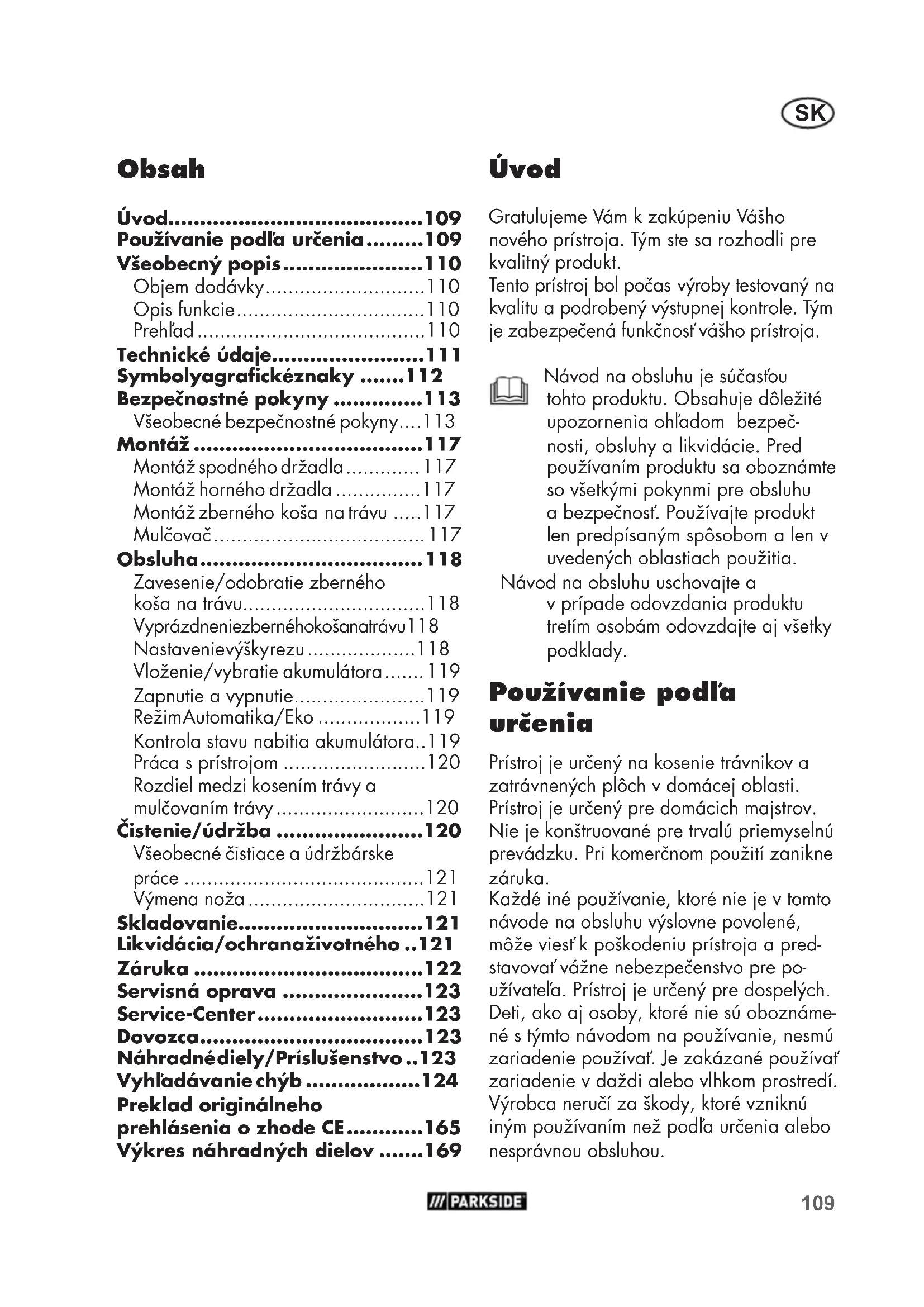 - Úvod Gratulujeme Vám k zakúpeniu Vášho nového prístroja. Tým ste sa rozhodli pre kvalitný produkt. Tento prístroj bol počas výroby testovaný na kvalitu a podrobený výstupnej kontrole. Tým je zabezpečená funkčnosť vášho prístroja. Návod na obsluhu je súčasťou tohto produktu. Obsahuje dôležité upozornenia ohľadom bezpeč- nosti, obsluhy a likvidácie. Pred používaním produktu sa oboznámte so všetkými pokynmi pre obsluhu a bezpečnosť. Používajte produkt len predpísaným spôsobom a len v uvedených oblastiach použitia. Návod na obsluhu uschovajte a v prípade odovzdania produktu tretím osobám odovzdajte aj všetky podklady. Používanie podľa určenia Prístroj je určený na kosenie trávnikov a zatrávnených plôch v domácej oblasti. Prístroj je určený pre domácich majstrov. Nie je konštruované pre trvalú priemyselnú prevádzku. Pri komerčnom použití zanikne záruka. Každé iné používanie, ktoré nie je v tomto návode na obsluhu výslovne povolené, môže viesť k poškodeniu prístroja a pred- stavovať vážne nebezpečenstvo pre po- užívateľa. Prístroj je určený pre dospelých. Deti, ako aj osoby, ktoré nie sú oboznáme- né s týmto návodom na používanie, nesmú zariadenie používať. Je zakázané používať zariadenie v daždi alebo vlhkom prostredí. Výrobca neručí za škody, ktoré vzniknú iným používaním než podľa určenia alebo nesprávnou obsluhou. Preklad originálneho prehlásenia o zhode CE p. 165
