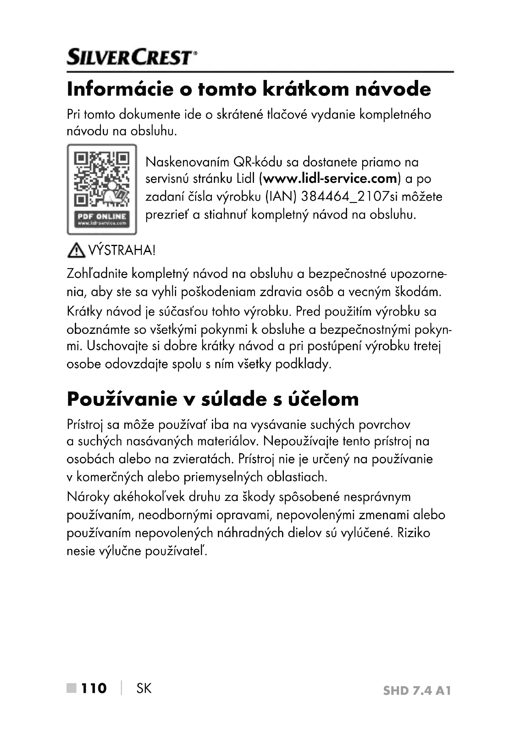 SK Informácie o tomto krátkom návode Pri tomto dokumente ide o skrátené tlačové vydanie kompletného návodu na obsluhu. Naskenovaním QR-kódu sa dostanete priamo na servisnú stránku Lidl (www.lidl-service.com) a po zadaní čísla výrobku (IAN) 384464_2107si môžete prezrieť a stiahnuť kompletný návod na obsluhu. VÝSTRAHA! Zohľadnite kompletný návod na obsluhu a bezpečnostné upozorne- nia, aby ste sa vyhli poškodeniam zdravia osôb a vecným škodám. Krátky návod je súčasťou tohto výrobku. Pred použitím výrobku sa oboznámte sovšetkými pokynmi k obsluhe a bezpečnostnými pokyn- mi. Uschovajte si dobre krátky návod a pri postúpení výrobku tretej osobe odovzdajte spolu sním všetky podklady. Používanie v súlade s účelom Prístroj sa môže používať iba na vysávanie suchých povrchov a suchých nasávaných materiálov. Nepoužívajte tento prístroj na osobách alebo na zvieratách. Prístroj nie je určený na používanie v komerčných alebo priemyselných oblastiach. Nároky akéhokoľvek druhu za škody spôsobené nesprávnym používaním, neodbornými opravami, nepovolenými zmenami alebo používaním nepovolených náhradných dielov sú vylúčené. Riziko nesie výlučne používateľ.SHD 7.4 A1 SK