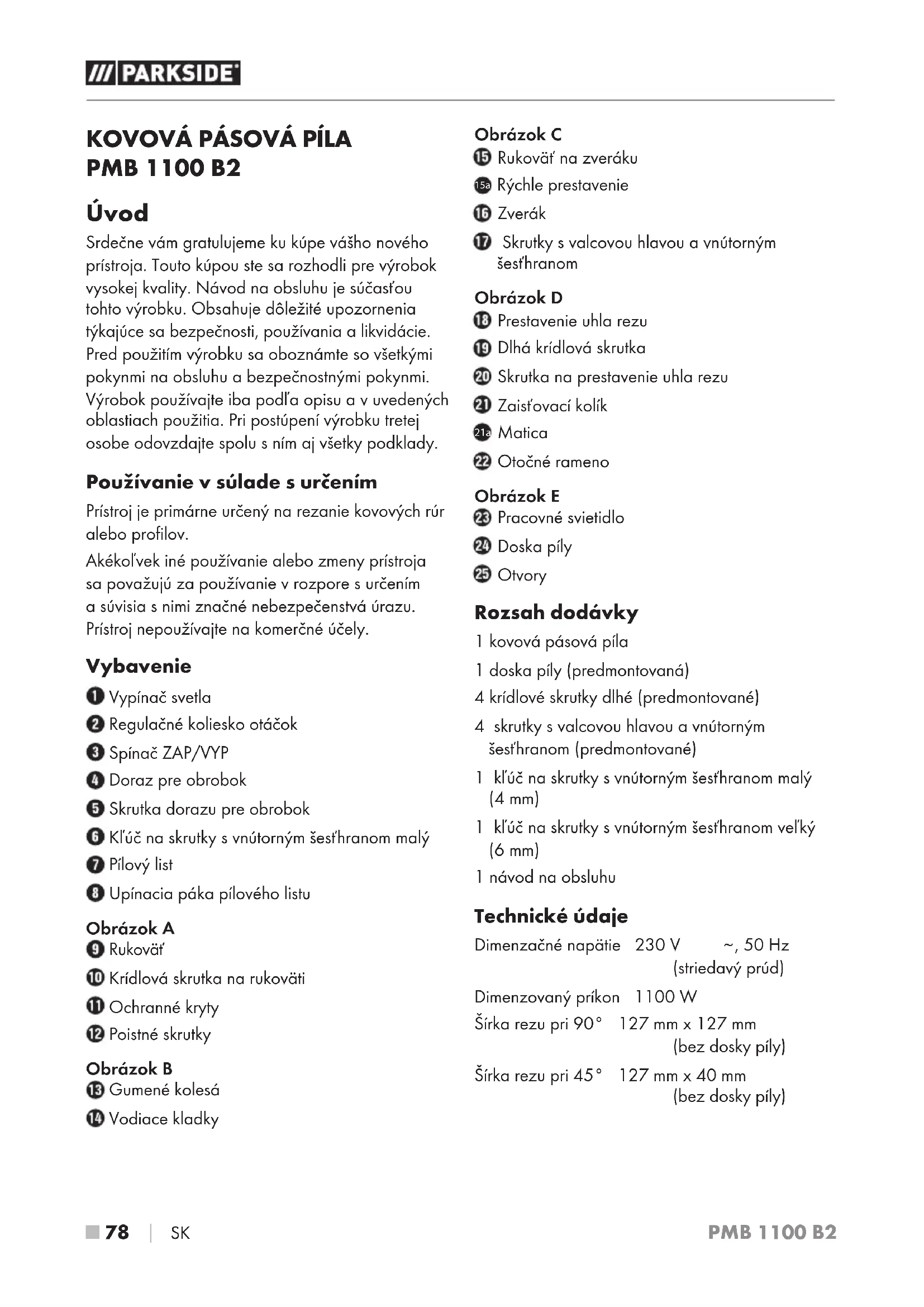 PMB 1100 B2 Úvod Srdečne vám gratulujeme kukúpe vášho nového prístroja. Touto kúpou ste sa rozhodli pre výrobok vysokej kvality. Návod na obsluhu je súčasťou tohto výrobku. Obsahuje dôležité upozornenia týkajúce sa bezpečnosti, používania a likvidácie. Pred použitím výrobku sa oboznámte sovšetkými pokynmi na obsluhu a bezpečnostnými pokynmi. Výrobok používajte iba podľa opisu a vuvedených oblastiach použitia. Pri postúpení výrobku tretej osobe odovzdajte spolu sním aj všetky podklady. Používanie vsúlade surčením Prístroj je primárne určený na rezanie kovových rúr alebo profilov. Akékoľvek iné používanie alebo zmeny prístroja sa považujú za používanie v rozpore surčením a súvisia s nimi značné nebezpečenstvá úrazu. Prístroj nepoužívajte na komerčné účely. Vybavenie Vypínač svetla Regulačné koliesko otáčok Spínač ZAP/VYP Doraz pre obrobok Skrutka dorazu pre obrobok Kľúč na skrutky s vnútorným šesťhranom malý Pílový list Upínacia páka pílového listu Obrázok A Rukoväť Krídlová skrutka na rukoväti Ochranné kryty Poistné skrutky Obrázok B Gumené kolesá Vodiace kladky Obrázok C Rukoväť na zveráku 15a Rýchle prestavenie Zverák Skrutky s valcovou hlavou a vnútorným šesťhranom Obrázok D Prestavenie uhla rezu Dlhá krídlová skrutka Skrutka na prestavenie uhla rezu Zaisťovací kolík 21a Matica Otočné rameno Obrázok E Pracovné svietidlo Doska píly Otvory Rozsah dodávky 1 kovová pásová píla 1 doska píly (predmontovaná) 4 krídlové skrutky dlhé (predmontované) 4 skrutky s valcovou hlavou a vnútorným šesťhranom (predmontované) 1 kľúč na skrutky s vnútorným šesťhranom malý (4 mm) 1 kľúč na skrutky s vnútorným šesťhranom veľký (6 mm) 1 návod na obsluhu Technické údaje Dimenzačné napätie 230 V
