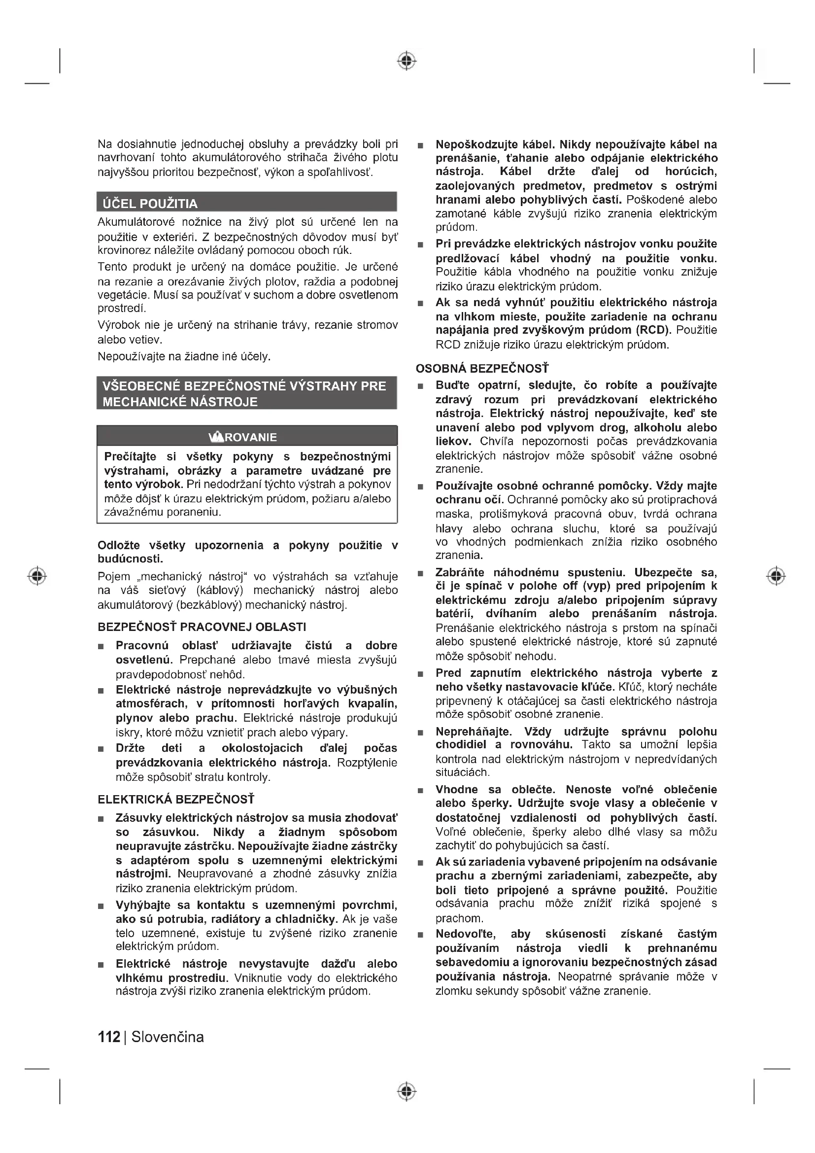 Akumulátorové nožnice na živý plot sú určené len na použitie v exteriéri. Z bezpečnostných dôvodov musí byť krovinorez náležite ovládaný pomocou oboch rúk. Tento produkt je určený na domáce použitie. Je určené na rezanie a orezávanie živých plotov, raždia a podobnej vegetácie. Musí sa používať v suchom a dobre osvetlenom prostredí. Výrobok nie je určený na strihanie trávy, rezanie stromov alebo vetiev. Nepoužívajte na žiadne iné účely. VŠEOBECNÉ BEZPEČNOSTNÉ VÝSTRAHY PRE