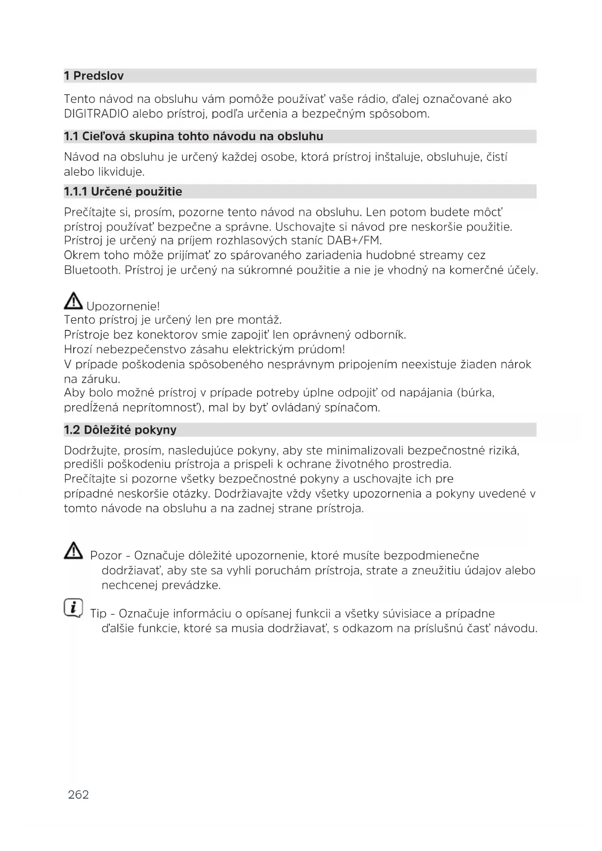 Dodržujte, prosím, nasledujúce pokyny, aby ste minimalizovali bezpečnostné riziká, predišli poškodeniu prístroja a prispeli k ochrane životného prostredia. Prečítajte si pozorne všetky bezpečnostné pokyny a uschovajte ich pre prípadnéneskoršie otázky. Dodržiavajte vždy všetky upozornenia a pokyny uvedené v tomto návode na obsluhu a na zadnej strane prístroja. Pozor - Označuje dôležité upozornenie, ktoré musíte bezpodmienečne dodržiavať, aby ste sa vyhli poruchám prístroja, strate a zneužitiu údajov alebo nechcenej prevádzke. Tip - Označuje informáciu o opísanej funkcii a všetky súvisiace a prípadne ďalšie funkcie, ktoré sa musia dodržiavať, s odkazom na príslušnú časť návodu. 2621.2.1 Bezpečnosť Pre vašu ochranu si pozorne prečítajte bezpečnostné opatrenia pred použitím prístroja DIGITRADIO UP1. Výrobca nepreberá žiadne ručenie za škody vzniknuté neodbornou manipuláciou a nedodržiavaním nižšie uvedených bezpečnostných opatrení. Tento prístroj je určený len pre montáž. Prístroje bez konektorov smie zapojiť len oprávnený odborník. Hrozí nebezpečenstvo zásahu elektrickým prúdom! V prípade poškodenia spôsobeného nesprávnym pripojením neexistuje žiaden nárok na záruku. Prístroj nikdy neotvárajte! Dotyk s časťami, ktoré sú pod napätím, je životu nebezpečný! Akékoľvek nevyhnutné zásahy do prístroja smie vykonávať len vyškolený personál. Prístroj sa smie prevádzkovať len v miernom podnebí. Prístroj nevystavujte kvapkajúcej alebo striekajúcej vode. Ak sa do prístroja dostane voda, vypnite ho a kontaktujte servisné oddelenie. Prístroj nikdy neumiestňujte do blízkosti zdrojov tepla, ktoré by ho mohli zohriať nad rámec prevádzkovej teploty. V prípade akejkoľvek poruchy, ak sa zprístrojašíri neobvyklýzápach alebo dym, pri vážnych chybných funkciách alebo pri poškodení krytu prístroj vypnite a kontaktujte servisné oddelenie. Prístroj sa smie pripájať len k sieťovému napätiu 100V-240V~, 50/60 Hz. Nikdy sa nepokúšajte prevádzkovať pristroj s iným napätím. Ak prístroj vykazuje akékoľvek známky poškodenia, nesmie byť uvedený do prevádzky.