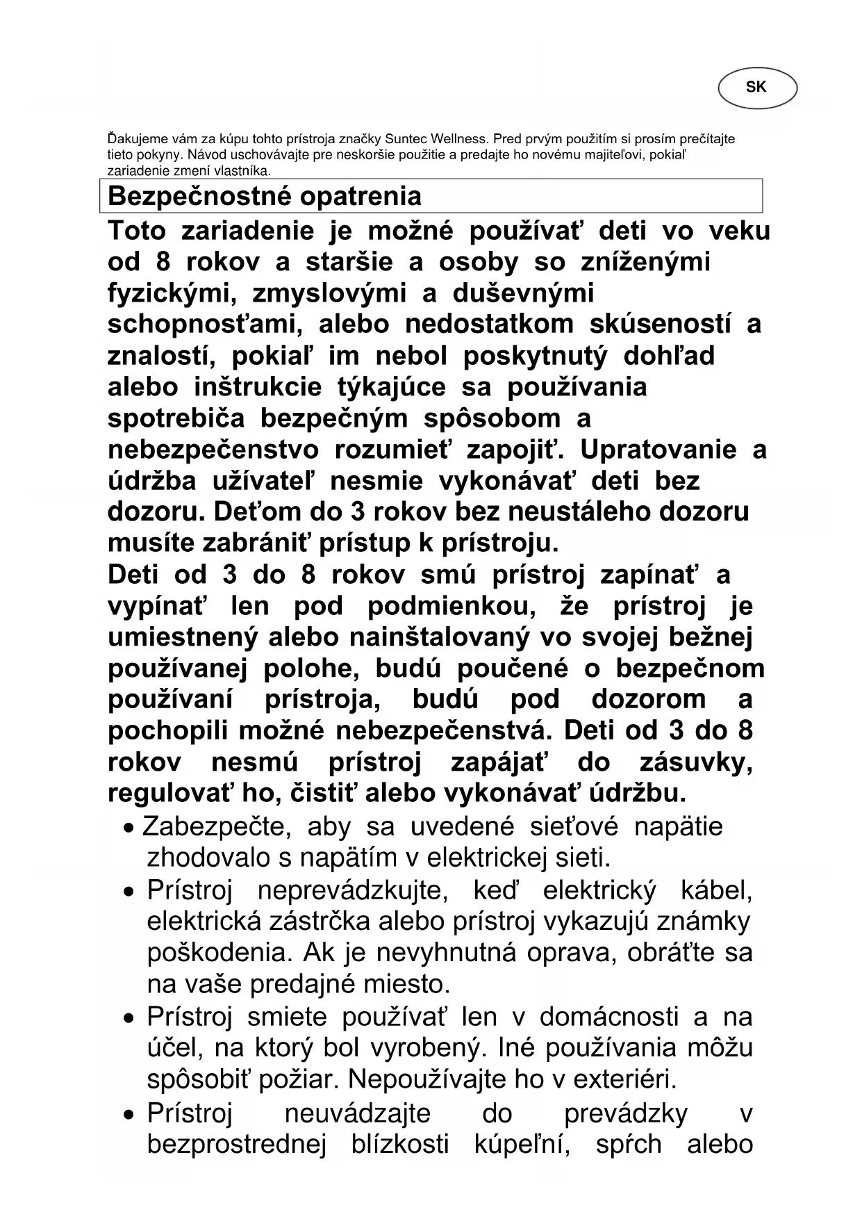 Heat Protect SUNTEC WELLNESS GMBH / HOLZSTRASSE 2 / 40221 DÜSSELDORF / GERMANY Izjava o skladnosti ES:Ďakujeme vám za kúpu tohto prístroja značky Suntec Wellness. Pred prvým použitím si prosím prečítajte tieto pokyny. Návod uschovávajte pre neskoršie použitie a predajte ho novému majiteľovi, pokiaľ zariadenie zmení vlastníka. Bezpečnostné opatrenia Toto zariadenie je možné používať deti vo veku od 8 rokov a staršie a osoby so zníženými fyzickými, zmyslovými a duševnými schopnosťami, alebo nedostatkom skúseností a znalostí, pokiaľ im nebol poskytnutý dohľad alebo inštrukcie týkajúce sa používania spotrebiča bezpečným spôsobom a nebezpečenstvo rozumieť zapojiť. Upratovanie a údržba užívateľ nesmie vykonávať deti bez dozoru. Deťom do 3 rokov bez neustáleho dozoru musíte zabrániť prístup k prístroju. Deti od 3 do 8 rokov smú prístroj zapínať a vypínať len pod podmienkou, že prístroj je umiestnený alebo nainštalovaný vo svojej bežnej používanej polohe, budú poučené o bezpečnom používaní prístroja, budú pod dozorom a pochopili možné nebezpečenstvá. Deti od 3 do 8 rokov nesmú prístroj zapájať do zásuvky, regulovať ho, čistiť alebo vykonávať údržbu.