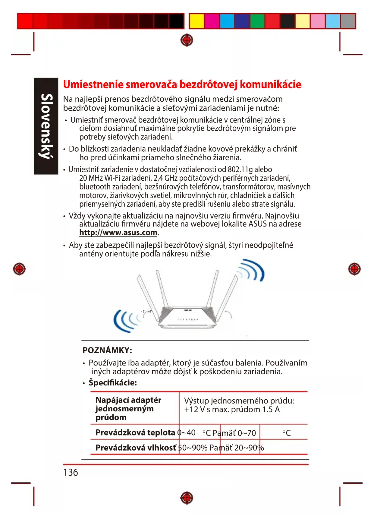 Slovenský Umiestnenie smerovača bezdrôtovej komunikácie Umiestnenie smerovača bezdrôtovej komunikácie Na najlepší prenos bezdrôtového signálu medzi smerovačom bezdrôtovej komunikácie a sieťovými zariadeniami je nutné: