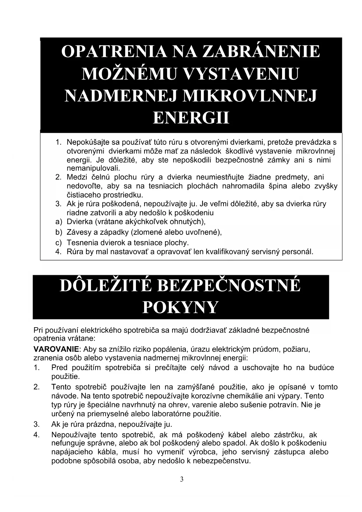 POKYNY Pri používaní elektrického spotrebiča sa majú dodržiavať základné bezpečnostné opatrenia vrátane: VAROVANIE: Aby sa znížilo riziko popálenia, úrazu elektrickým prúdom, požiaru, zranenia osôb alebo vystavenia nadmernej mikrovlnnej energii: