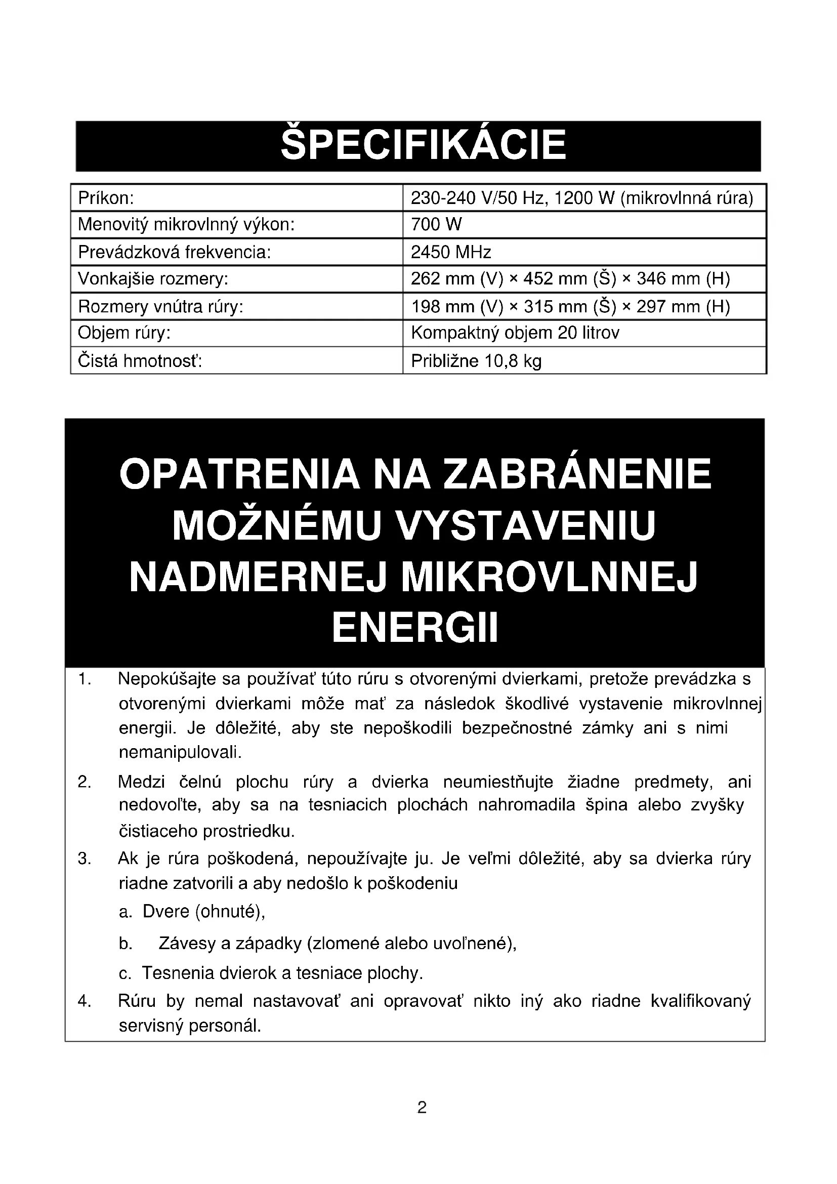 ŠPECIFIKÁCIE Príkon: 230-240 V/50 Hz, 1200 W (mikrovlnná rúra) Menovitý mikrovlnný výkon: 700 W Prevádzková frekvencia: 2450 MHz Vonkajšie rozmery: 262 mm (V) × 452 mm (Š) × 346 mm (H) Rozmery vnútra rúry: 198 mm (V) × 315 mm (Š) × 297 mm (H) Objem rúry: Kompaktný objem 20 litrov Čistá hmotnosť: Približne 10,8 kg