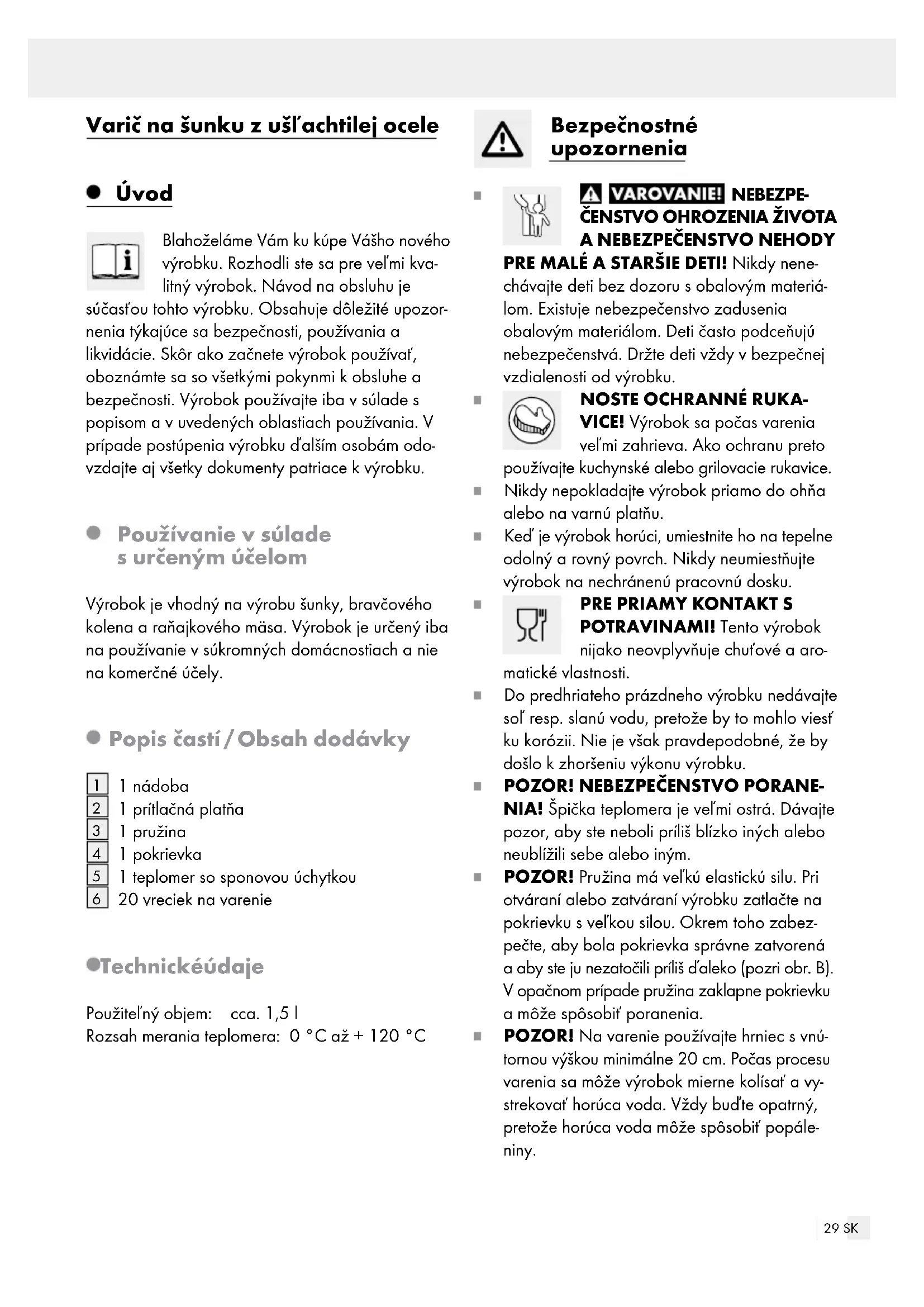 NIA! Špička teplomera je veľmi ostrá. Dávajte pozor, aby ste neboli príliš blízko iných alebo neublížili sebe alebo iným. POZOR! Pružina má veľkú elastickú silu. Pri otváraní alebo zatváraní výrobku zatlačte na pokrievku s veľkou silou. Okrem toho zabez- pečte, aby bola pokrievka správne zatvorená a aby ste ju nezatočili príliš ďaleko (pozri obr. B). V opačnom prípade pružina zaklapne pokrievku a môže spôsobiť poranenia. POZOR! Na varenie používajte hrniec s vnú- tornou výškou minimálne 20 cm. Počas procesu varenia sa môže výrobok mierne kolísať a vy- strekovať horúca voda. Vždy buďte opatrný, pretože horúca voda môže spôsobiť popále- niny.30 SK POZOR! Myslite na to, že pri dusení môže z pokrievky vystupovať horúci mäsový extrakt. Je to normálne. Nenakláňajte výrobok, aby ste zabránili vytekaniu horúceho mäsového ex- traktu a aby ste sa tým nepopálili. Používanie Pred prvým použitím výrobku ho vyčistite teplou vodou, aby ste úplne odstránili všetky zvyšky z výroby. Následne výrobok dobre opláchnite a dôkladne ho osušte. Vložte vrecko na varenie