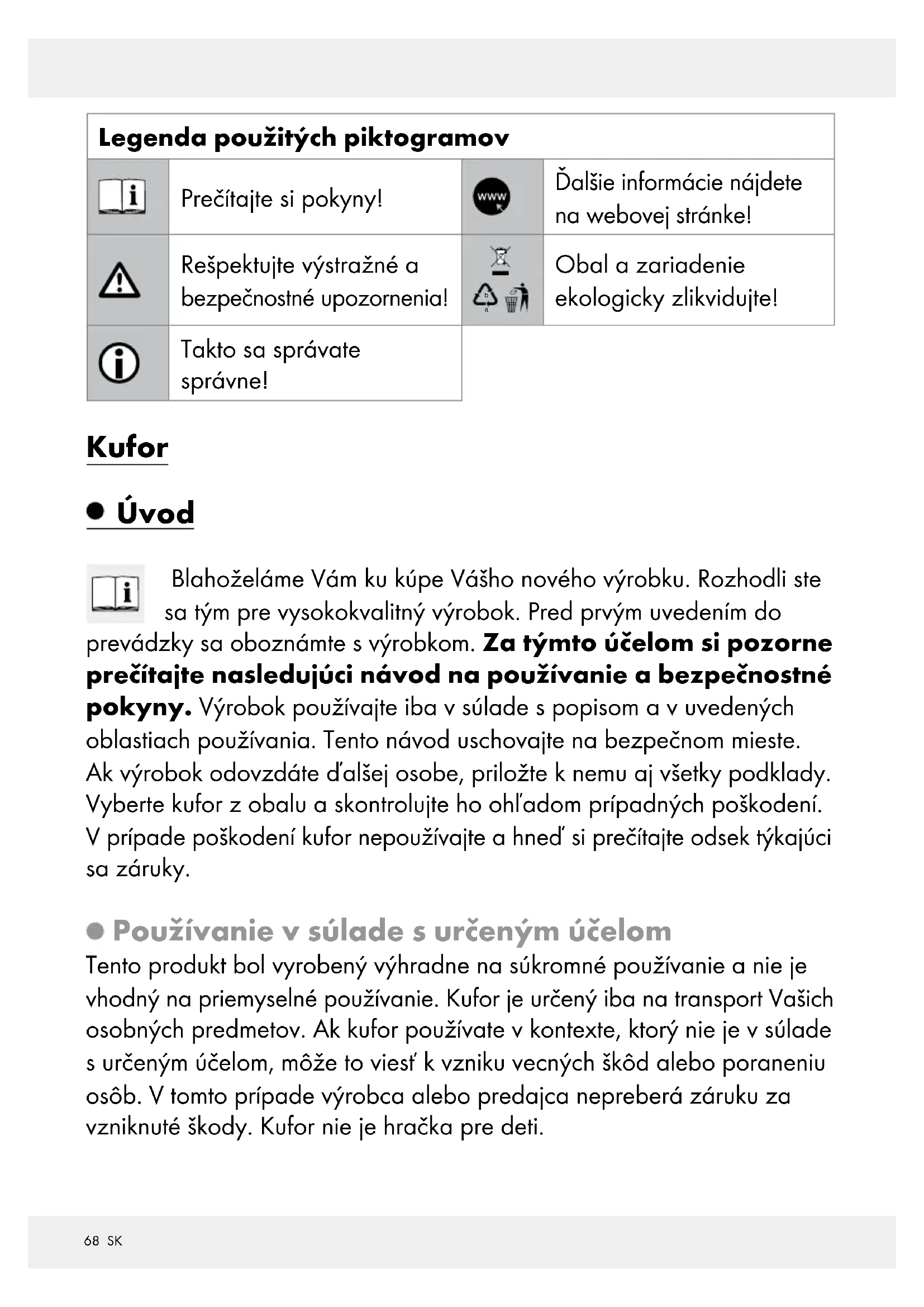 Obal a zariadenie ekologicky zlikvidujte! Takto sa správate správne! Kufor Úvod Blahoželáme Vám ku kúpe Vášho nového výrobku. Rozhodli ste sa tým pre vysokokvalitný výrobok. Pred prvým uvedením do prevádzky sa oboznámte s výrobkom. Za týmto účelom si pozorne prečítajte nasledujúci návod na používanie a bezpečnostné pokyny. Výrobok používajte iba v súlade s popisom a v uvedených oblastiach používania. Tento návod uschovajte na bezpečnom mieste. Ak výrobok odovzdáte ďalšej osobe, priložte k nemu aj všetky podklady. Vyberte kufor z obalu a skontrolujte ho ohľadom prípadných poškodení. V prípade poškodení kufor nepoužívajte a hneď si prečítajte odsek týkajúci sa záruky. Používanie v súlade s určeným účelom Tento produkt bol vyrobený výhradne na súkromné používanie a nie je vhodný na priemyselné používanie. Kufor je určený iba na transport Vašich osobných predmetov. Ak kufor používate v kontexte, ktorý nie je v súlade s určeným účelom, môže to viesť k vzniku vecných škôd alebo poraneniu osôb. V tomto prípade výrobca alebo predajca nepreberá záruku za vzniknuté škody. Kufor nie je hračka pre deti.69 SK Popis častí