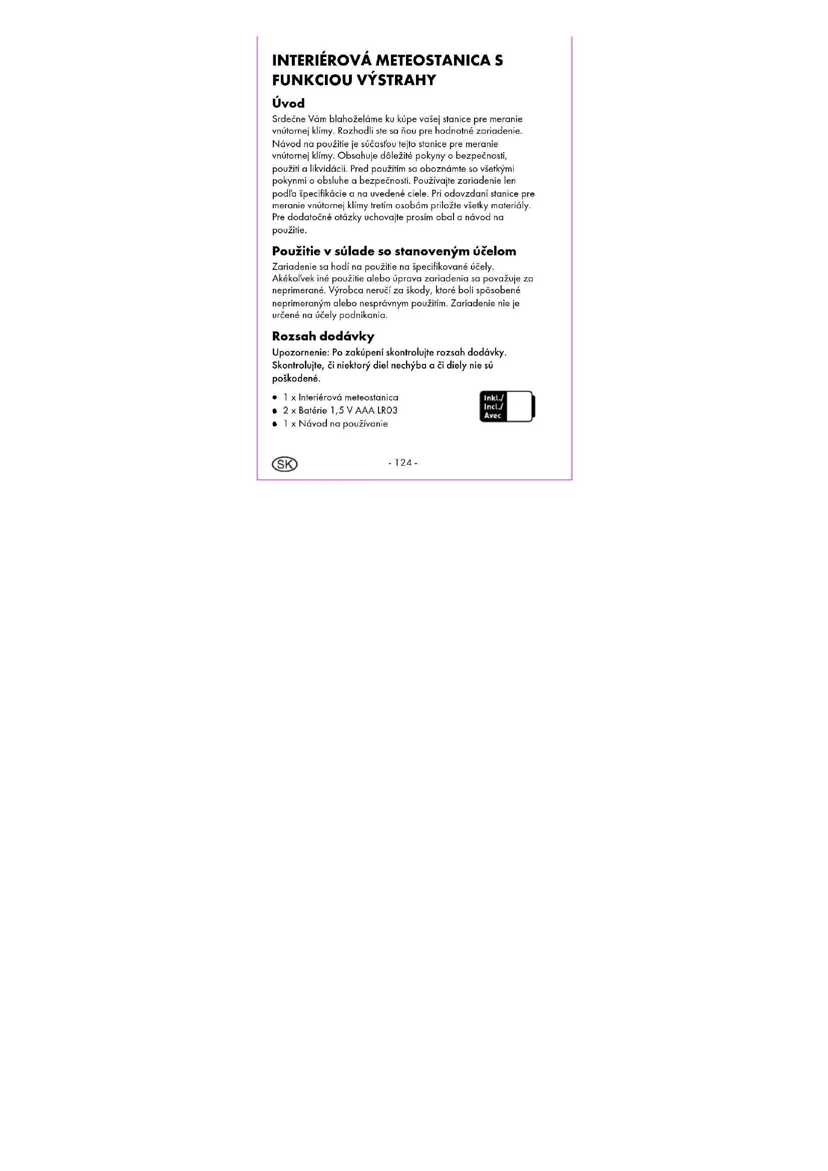 Úvod Srdečne Vám blahoželáme ku kúpe vašej stanice pre meranie vnútornej klímy. Rozhodli ste sa ňou pre hodnotné zariadenie. Návod na použitie je súčasťou tejto stanice pre meranie vnútornej klímy. Obsahuje dôležité pokyny o bezpečnosti, použití a likvidácii. Pred použitím sa oboznámte so všetkými pokynmi o obsluhe a bezpečnosti. Používajte zariadenie len podľa špecifikácie a na uvedené ciele. Pri odovzdaní stanice pre meranie vnútornej klímy tretím osobám priložte všetky materiály. Pre dodatočné otázky uchovajte prosím obal a návod na použitie. Použitie v súlade so stanoveným účelom Zariadenie sa hodí na použitie na špecifikované účely. Akékoľvek iné použitie alebo úprava zariadenia sa považuje za neprimerané. Výrobca neručí za škody, ktoré boli spôsobené neprimeraným alebo nesprávnym použitím. Zariadenie nie je určené na účely podnikania. Rozsah dodávky Upozornenie: Po zakúpení skontrolujte rozsah dodávky. Skontrolujte, či niektorý diel nechýba a či diely nie sú poškodené.