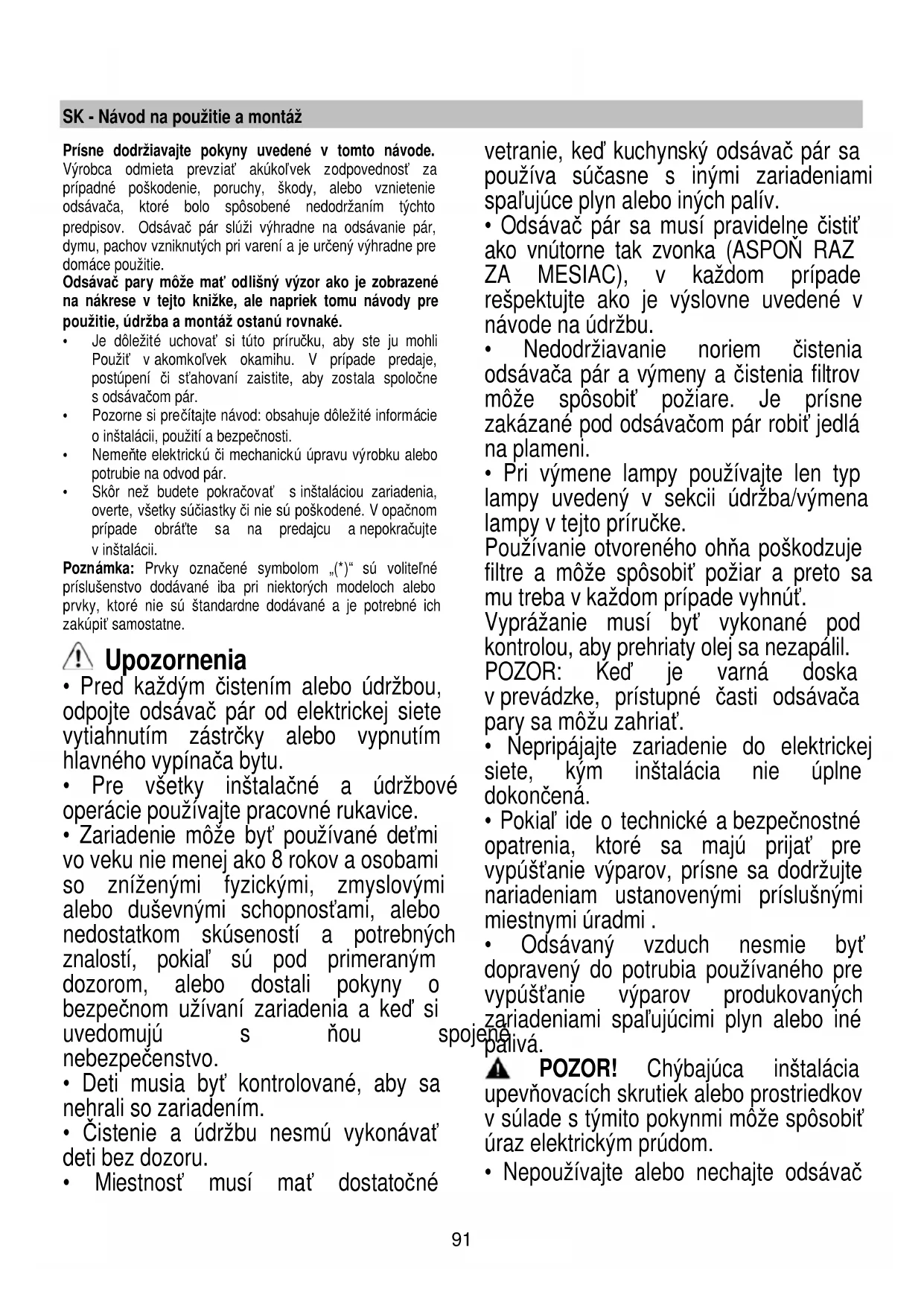 - Miestnosť musí mať dostatočné vetranie, keď kuchynský odsávač pár sa používa súčasne s inými zariadeniami spaľujúce plyn alebo iných palív.