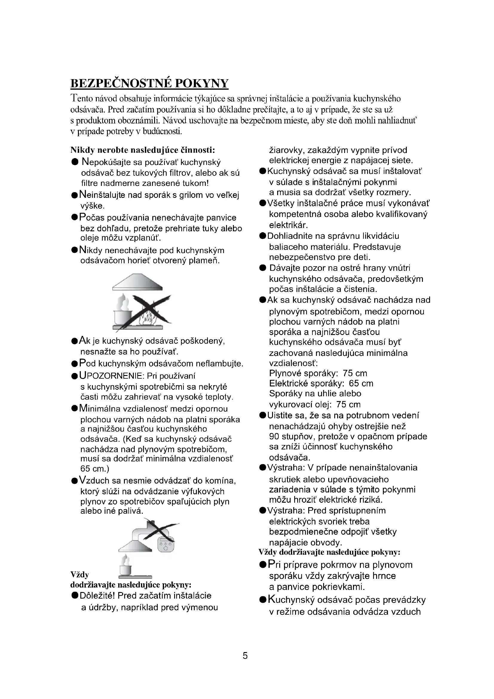 Vždy dodržiavajte nasledujúce pokyny: ●Dôležité! Pred začatím inštalácie a údržby, napríklad pred výmenou žiarovky, zakaždým vypnite prívod elektrickej energie z napájacej siete. ●Kuchynský odsávač sa musí inštalovať v súlade s inštalačnými pokynmi a musia sa dodržať všetky rozmery. ●Všetky inštalačné práce musí vykonávať kompetentná osoba alebo kvalifikovaný elektrikár. ●Dohliadnite na správnu likvidáciu baliaceho materiálu. Predstavuje nebezpečenstvo pre deti. ● Dávajte pozor na ostré hrany vnútri kuchynského odsávača, predovšetkým počas inštalácie a čistenia. ●Ak sa kuchynský odsávač nachádza nad plynovým spotrebičom, medzi opornou plochou varných nádob na platni sporáka a najnižšou časťou kuchynského odsávača musí byť zachovaná nasledujúca minimálna vzdialenosť: Plynové sporáky: 75 cm Elektrické sporáky: 65 cm Sporáky na uhlie alebo vykurovací olej: 75 cm ●Uistite sa, že sa na potrubnom vedení nenachádzajú ohyby ostrejšie než 90 stupňov, pretože v opačnom prípade sa zníži účinnosť kuchynského odsávača. ●Výstraha: V prípade nenainštalovania skrutiek alebo upevňovacieho zariadenia v súlade s týmito pokynmi môžu hroziť elektrické riziká. ●Výstraha: Pred sprístupnením elektrických svoriek treba bezpodmienečne odpojiť všetky napájacie obvody. Vždy dodržiavajte nasledujúce pokyny: ●Pri príprave pokrmov na plynovom sporáku vždy zakrývajte hrnce a panvice pokrievkami. ●Kuchynský odsávač počas prevádzky v režime odsávania odvádza vzduch 51z miestnosti. Dohliadnite na dodržiavanie vhodných opatrení týkajúcich sa vetrania. Kuchynský odsávač odstraňuje z miestnosti pachy, no neodstraňuje paru. ●Kuchynský odsávač pár je určený iba na použitie v domácnosti. ●Ak je prívodný kábel poškodený, musí ho vymeniť výrobca, jeho servisný zástupca alebo osoby s podobnou kvalifikáciou, aby sa predišlo nebezpečenstvu. ●Deti staršie ako 8 rokov a osoby s obmedzenými fyzickými, zmyslovými alebo duševnými schopnosťami alebo s nedostatkom skúseností a vedomostí môžu používať tento spotrebič, ak sú pod dohľadom alebo dostali pokyny týkajúce sa bezpečného používania spotrebiča a ak rozumejú možným rizikám. Deti sa so spotrebičom nesmú hrať. Čistenie a údržbu nesmú vykonávať deti bez dozoru. Vždy dodržiavajte nasledujúce pokyny: ●Upozornenie: Spotrebič a jeho nekryté časti sa počas prevádzky môžu zahrievať na vysoké teploty. Dávajte pozor, aby ste sa nedotkli nahriatych prvkov. Deti mladšie než 8 rokov nesmú mať prístup k zariadeniu, pokiaľ nie sú pod neustálym dozorom. ●Ak sa kuchynský odsávač používa súčasne so spotrebičmi spaľujúcimi plyn alebo iné palivá, treba zaistiť dostatočné vetranie miestnosti. ●Ak sa nevykonáva čistenie v súlade s pokynmi, hrozí riziko požiaru. ●Je potrebné zaistiť plnenie nariadení týkajúcich sa odvádzania vzduchu. ●Spotrebič pravidelne čistite podľa postupu uvedeného v kapitole ÚDRŽBA. ●Z bezpečnostných dôvodov používajte iba tie veľkosti upevňovacích alebo montážnych skrutiek, ktoré sú uvedené v tomto návode na obsluhu. ●Podrobné informácie o postupe a intervaloch čistenia nájdete v časti tohto návodu na obsluhu venovanej údržbe a čisteniu. ●Deti bez dozoru nesmú čistiť spotrebič ani vykonávať jeho bežnú údržbu. ●Keď sa kuchynský odsávač používa súčasne so spotrebičmi napájanými inou než elektrickou energiou, záporný tlak v miestnosti nesmie prekročiť 4 Pa (4 x 10-5 bar). ●VÝSTRAHA: Nebezpečenstvo požiaru: na povrch varnej dosky neodkladajte žiadne predmety. ●Nepoužívajte parný čistič. ●Požiar sa NIKDY nepokúšajte hasiť vodou. Vypnite spotrebič a potom zakryte plameň napr. pokrievkou alebo hasiacou dekou.