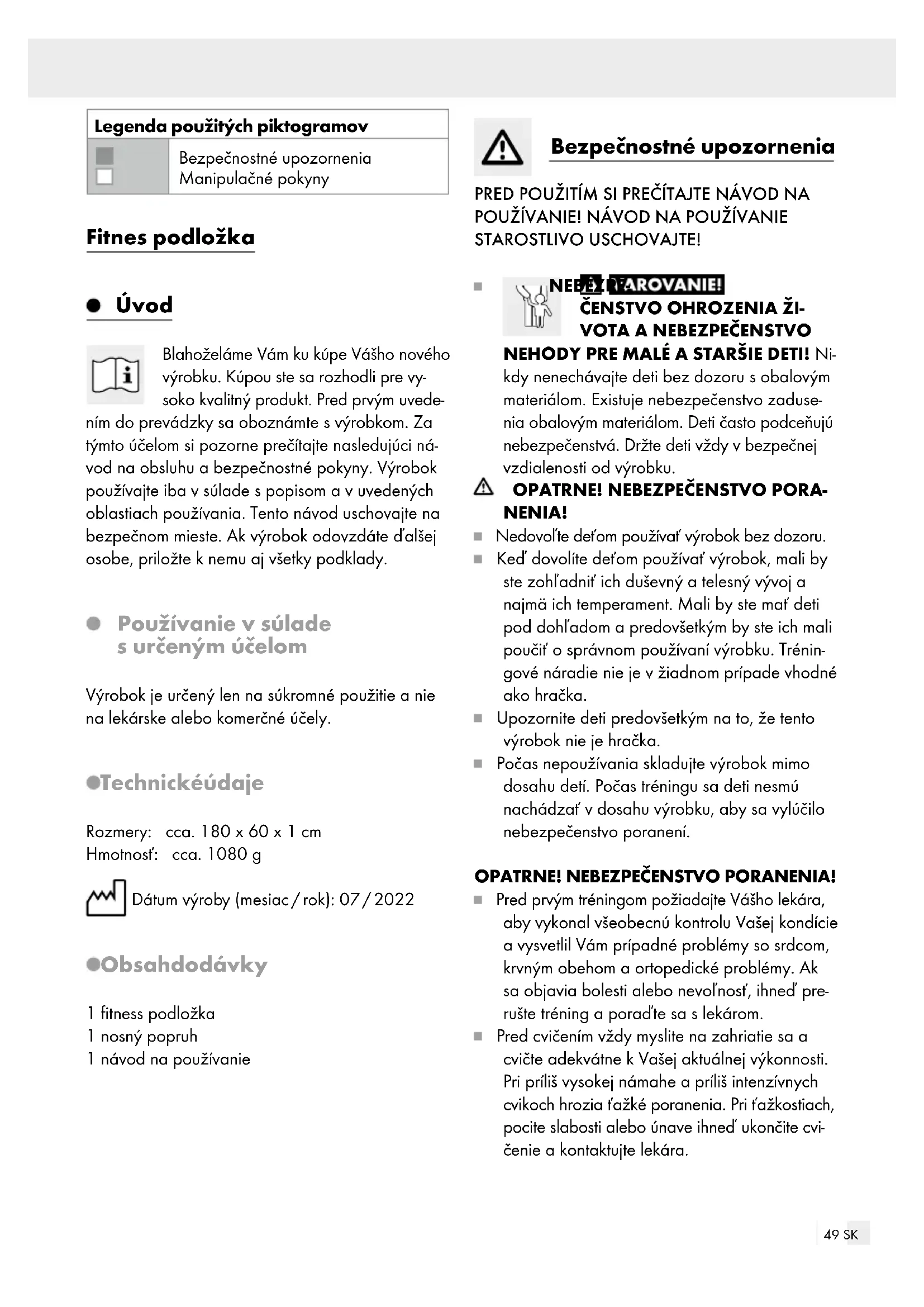NENIA! Nedovoľte deťom používať výrobok bez dozoru. Keď dovolíte deťom používať výrobok, mali by ste zohľadniť ich duševný a telesný vývoj a najmä ich temperament. Mali by ste mať deti pod dohľadom a predovšetkým by ste ich mali poučiť o správnom používaní výrobku. Trénin- gové náradie nie je v žiadnom prípade vhodné ako hračka. Upozornite deti predovšetkým na to, že tento výrobok nie je hračka. Počas nepoužívania skladujte výrobok mimo dosahu detí. Počas tréningu sa deti nesmú nachádzať v dosahu výrobku, aby sa vylúčilo nebezpečenstvo poranení. OPATRNE! NEBEZPEČENSTVO PORANENIA! Pred prvým tréningom požiadajte Vášho lekára, aby vykonal všeobecnú kontrolu Vašej kondície a vysvetlil Vám prípadné problémy so srdcom, krvným obehom a ortopedické problémy. Ak sa objavia bolesti alebo nevoľnosť, ihneď pre- rušte tréning a poraďte sa s lekárom. Pred cvičením vždy myslite na zahriatie sa a cvičte adekvátne k Vašej aktuálnej výkonnosti. Pri príliš vysokej námahe a príliš intenzívnych cvikoch hrozia ťažké poranenia. Pri ťažkostiach, pocite slabosti alebo únave ihneď ukončite cvi- čenie a kontaktujte lekára.50 SK Venujte pozornosť signálom Vášho tela. Ne- správny alebo nadmerný tréning môže ohroziť Vaše zdravie. Ak počas tréningu pocítite bolesť, pocit tiesne v hrudníku, nepravidelný tlkot srdca, extrémnu dýchavičnosť, závraty alebo točenie hlavy, okamžite prerušte tréning a kontaktujte Vášho lekára. Tehotné ženy by mali trénovať iba po dohovore s ich lekárom. Skôr, ako výrobok použijete, skontrolujte, či nie je poškodený a / alebo opotrebovaný. Výrobok nepoužívajte, ak je poškodený. Nepoužívajte výrobok v blízkosti schodov alebo vyvýšenín. Výrobok nikdy nepoužívajte v blízkosti otvore- ného ohňa alebo krbu. Výrobok nesmie byť používaný vo vode alebo na plávanie! Neposkytuje oporu na vodnej hladine ani nie je vhodný ako pomôcka na plá- vanie. Slaná a chlórová voda môže poškodiť povrch výrobku. Výrobok po použití uskladnite na suchom mieste. Nenechávajte výrobok bez dozoru. Bezpečný tréning si vyžaduje dostatok priestoru. Počas tréningu udržiavajte odstup minimálne 0,6 m od seba a od výrobku (obr. G). Výrobok bol testovaný podľa normy ISO 20957-1. Je určený len na domáce použitie. Pri cvičení noste vhodné oblečenie a obuv s protišmykovou podrážkou. Výrobok používajte len na rovnom a nekĺzavom povrchu. Nebezpečenstvo skrze opotrebovanie Výrobok možno používať iba v bezchybnom stave. Pred každým použitím skontrolujte výro- bok ohľadom prípadných poškodení alebo opotrebovania. Bezpečnosť výrobku môže byť zaručená len vtedy, keď je pravidelne kontrolo- vaný ohľadom poškodení a opotrebovania. V prípade poškodení už výrobok nesmiete používať. Počas skladovania chráňte výrobok pred ex- trémnymi teplotami, priamym slnečným žiarením a vlhkosťou. Nesprávne skladovanie a používa- nie výrobku môžu viesť k predčasnému opotrebovaniu výrobku, čo môže mať za násle- dok poranenia. Nebezpečenstvo vzniku vecných po- škodení! Zabráňte kontaktu výrobku s ostrými, horúcimi alebo nebezpečnými objektami. Všeobecné pokyny k tréningu Pred každým tréningom sa dobre zahrejte a ukončite ho postupne. Netrénujte, ak sa necítite dobre alebo ste chorý. Počas cvičenia dbajte na správne držanie tela. Správne prevedenie cvikov si podľa možností prvý krát nechajte ukázať skúseným fyziotera- peutom. Ako začiatočník nikdy netrénujte s príliš veľkou záťažou. Pomaly stupňujte intenzitu tréningu. Cvičenia vykonávajte rovnomerne, nie prudko a rýchlo. Dbajte na rovnomerné dýchanie. Pri námahe vydýchnite a pri úľave sa nadýchnite. Cviky vykonávajte nanajvýš tak dlho, pokiaľ sa cítite dobre, resp. pokiaľ ich dokážete vykoná- vať správne. Medzi cvikmi si doprajte dostatočne dlhé pre- stávky a dostatočne pite. Noste pohodlné športové oblečenie a športovú obuv. Všeobecný tréningový plán Vytvorte si tréningový plán prispôsobený Vašim potrebám pozostávajúci zo 6 až 8 cvičení. Dbajte na nasledujúce: Sami stanovte frekvenciu a intenzitu cvičení. Začnite pomaly 2 až 3 krát týždenne po 10 minút a postupne stupňujte frekvenciu a intenzitu cvičení. Čím častejšie a pravidelnejšie cvičíte, tým zdravšie a lepšie sa budete cítiť. Jedno cvičenie pozostáva z približne 15 opa- kovaní cviku. Cvičenie možno 3 krát zopakovať.51 SK Medzi cvičebnými zostavami si urobte 30-se- kundovú prestávku. Ak chcete budovať svaly, cvičte s menším počtom opakovaní, ale s vyššou váhou. Pred každým tréningom zahrejte svalové skupiny. Po každom tréningu odporúčame naťahovacie cviky. Zahriatie Pred každým tréningom venujte dostatok času za- hriatiu svalov. Nasledujúce cvičenia predstavujú iba výber z možných cvičení. Ďalšie cviky nájdete v príslušnej odbornej literatúre. Odporúčame každý cvik 2 až 3 krát zopakovať. Zahriatie svalstva krku a záhlavia: Pomaly pokladajte Vašu hlavu doľava a doprava. Tento pohyb zopakujte 4 až 5 krát. Potom pomaly krúžte hlavou najskôr do jednej a potom do druhej strany. Zahriatie svalstva ramien a pliec: Skrížte Vaše ruky za chrbtom a opatrne ich ťa- hajte hore. Pritom hornú časť tela predkloňte dopredu, aby sa svaly zahriali. Súčasne krúžte oboma Vašimi plecami smerom dopredu. Po jednej minúte zmeňte smer. Vytiahnite Vaše plecia smerom k ušiam a nechajte plecia opäť spadnúť. Krúžte striedavo Vaším ľavým a pravým rame- nom dopredu a po jednej minúte dozadu. Dôležité: Ďalej pritom pokojne dýchajte. Zahriatie svalstva nôh: Postavte sa na jednu nohu a druhú nohu nad- vihnite s pokrčeným kolenom cca. 20 cm od zeme. Najskôr krúžte s nadvihnutým chodidlom do jedného 