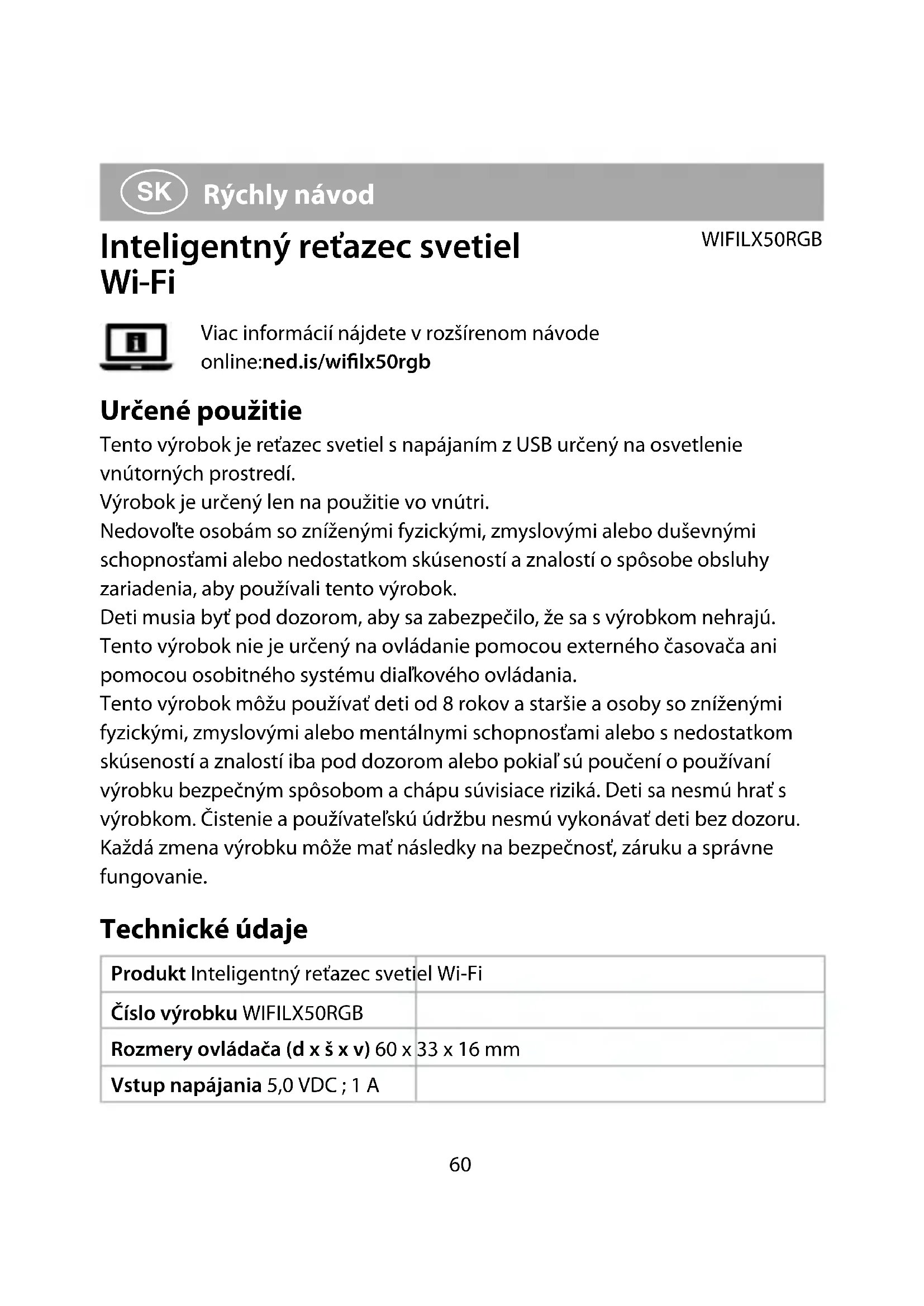 Rýchly návod Inteligentný reťazec svetiel Wi-Fi WIFILX50RGB Viac informácií nájdete v rozšírenom návode online:ned.is/wilx50rgb Určené použitie Tento výrobok je reťazec svetiel s napájaním z USB určený na osvetlenie vnútorných prostredí. Výrobok je určený len na použitie vo vnútri. Nedovoľte osobám so zníženými fyzickými, zmyslovými alebo duševnými schopnosťami alebo nedostatkom skúseností a znalostí o spôsobe obsluhy zariadenia, aby používali tento výrobok. Deti musia byť pod dozorom, aby sa zabezpečilo, že sa s výrobkom nehrajú. Tento výrobok nie je určený na ovládanie pomocou externého časovača ani pomocou osobitného systému diaľkového ovládania. Tento výrobok môžu používať deti od 8 rokov a staršie a osoby so zníženými fyzickými, zmyslovými alebo mentálnymi schopnosťami alebo s nedostatkom skúseností a znalostí iba pod dozorom alebo pokiaľ sú poučení o používaní výrobku bezpečným spôsobom a chápu súvisiace riziká. Deti sa nesmú hrať s výrobkom. Čistenie a používateľskú údržbu nesmú vykonávať deti bez dozoru. Každá zmena výrobku môže mať následky na bezpečnosť, záruku a správne fungovanie. Technické údaje Produkt Inteligentný reťazec svetiel Wi-Fi Číslo výrobku WIFILX50RGB Rozmery ovládača (d x š x v) 60 x 33 x 16 mm Vstup napájania 5,0 VDC ; 1 A61 Frekvenčné pásmo FM 2412 - 2472 MHz Maximálny prenosový výkon 16 dBm Hmotnosť 145g Dĺžka kábla 100 cm Dĺžka reťazca svetiel 500 cm Hlavné časti (obrázok A) 1 Napájací kábel USB 2 Vypínač 3 Tlačidlo farieb 4 Tlačidlo hudby 5 Mikrofón 6 Riadiaca jednotka 7 LED reťazec Bezpečnostné pokyny Nepoužívajte výrobok tam, kde by sa mohlo vyskytnúť špliechanie vody, napr. kúpeľňa, bazén alebo blízko umývadla.