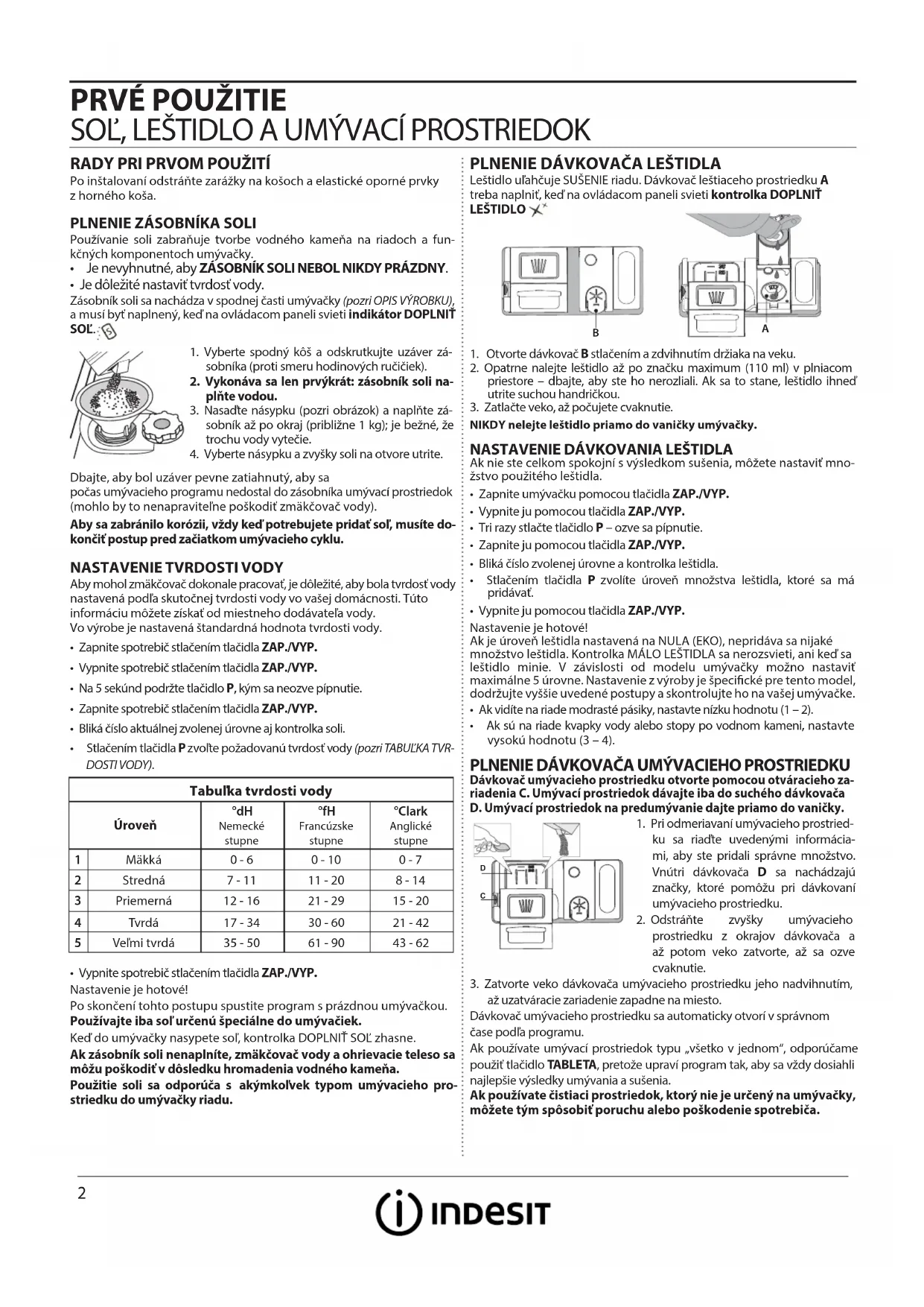 - Ak sú na riade kvapky vody alebo stopy po vodnom kameni, nastavte vysokú hodnotu (3 – 4). PLNENIE DÁVKOVAČA UMÝVACIEHO PROSTRIEDKU Dávkovač umývacieho prostriedku otvorte pomocou otváracieho za-riadenia C. Umývací prostriedok dávajte iba do suchého dávkovača D. Umývací prostriedok na predumývanie dajte priamo do vaničky.1. Pri odmeriavaní umývacieho prostried-ku sa riaďte uvedenými informácia-mi, aby ste pridali správne množstvo. Vnútri dávkovača D sa nachádzajú značky, ktoré pomôžu pri dávkovaní umývacieho prostriedku.2. Odstráňte zvyšky umývacieho prostriedku z okrajov dávkovača a až potom veko zatvorte, až sa ozve cvaknutie.3. Zatvorte veko dávkovača umývacieho prostriedku jeho nadvihnutím, až uzatváracie zariadenie zapadne na miesto.Dávkovač umývacieho prostriedku sa automaticky otvorí v správnomčase podľa programu. Ak používate umývací prostriedok typu „všetko v jednom“, odporúčame použiť tlačidlo TABLETA, pretože upraví program tak, aby sa vždy dosiahli najlepšie výsledky umývania a sušenia.Ak používate čistiaci prostriedok, ktorý nie je určený na umývačky, môžete tým spôsobiť poruchu alebo poškodenie spotrebiča. Tabuľka tvrdosti vody Úroveň °dH Nemecké stupne °fH Francúzske stupne°Clark Anglické stupne 1 Mäkká 0 - 6 0 - 10 0 - 7 2 Stredná 7 - 11 11 - 20 8 - 14 3 Priemerná 12 - 16 21 - 29 15 - 20 4 Tvrdá 17 - 34 30 - 60 21 - 42 5 Veľmi tvrdá 35 - 50 61 - 90 43 - 62