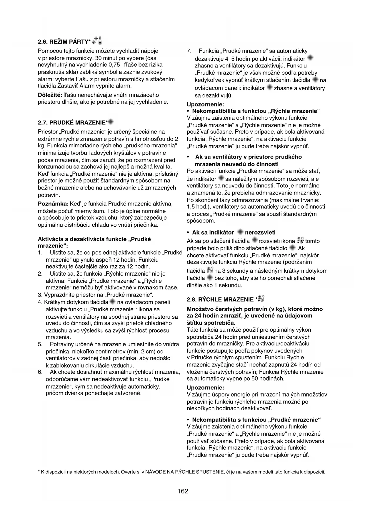 - Nekompatibilita s funkciou „Prudké mrazenie“ Vzáujmezaisteniaoptimálnehovýkonufunkcie „Prudkémrazenie“a„Rýchlemrazenie“niejemožné používaťsúčasne.Pretovprípade,akbolaaktivovaná funkcia„Rýchlemrazenie“,naaktiváciufunkcie „Prudkémrazenie“jubudetrebanajskôrvypnúť. *Kdispozíciinaniektorýchmodeloch.OvertesivNÁVODENARÝCHLESPUSTENIE,čijenavašommodelitátofunkciakdispozícii.163 *Kdispozíciinaniektorýchmodeloch.OvertesivNÁVODENARÝCHLESPUSTENIE,čijenavašommodelitátofunkciakdispozícii.