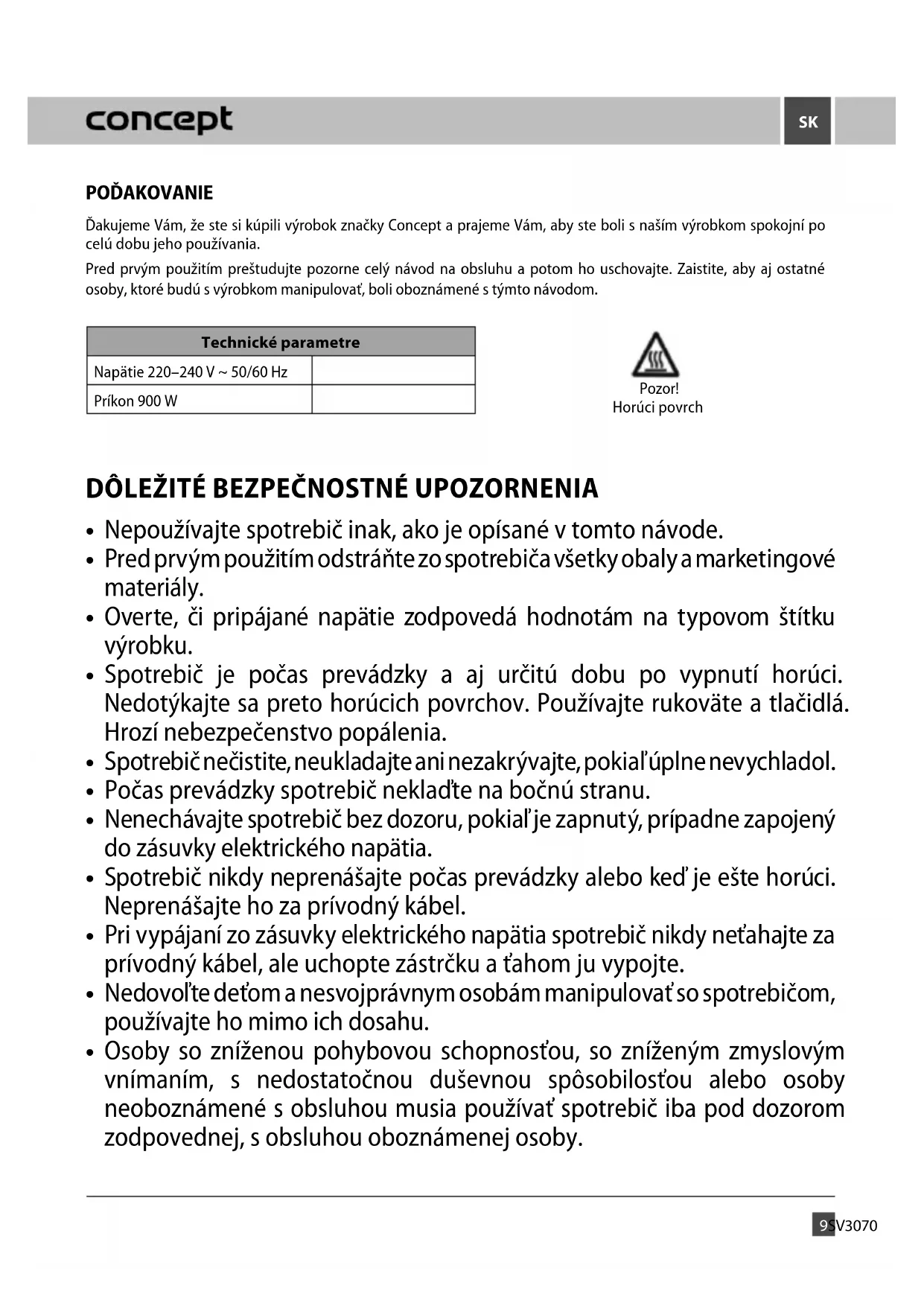 - Plastové vrecká z polyetylénu (PE) odovzdajte do zberu materiálu na recykláciu. Recyklácia spotrebiča na konci jeho životnosti: Symbol na výrobku alebo jeho balení udáva, že tento výrobok nepatrí do domáceho odpadu. Je nutné zaniesť ho do zberného miesta pre recykláciu elektrického a elektronického zariadenia. Zaistením správnej likvidácie tohto výrobku pomôžete zabrániť negatívnym dôsledkom pre životné prostredie a ľudské zdravie, ktoré by inak boli spôsobené nevhodnou likvidáciou tohto výrobku. Podrobnejšie informácie o recyklácii tohto výrobku zistíte na príslušnom miestnom úrade, služby pre likvidáciu domového odpadu alebo v obchode, kde ste výrobok zakúpili. Tento výrobok spĺňa všetky základné požiadavky smerníc EÚ, ktoré sa naň vzťahujú. Zmeny v texte, dizajne a technických špecifikáciách sa môžu meniť bez predchádzajúceho upozornenia a vyhradzujeme si právo na ich zmenu.PL 15S V3070 PODZIĘKOWANIE Dziękujemy za zakup produktu marki Concept i życzymy Państwu pełnej satysfakcji przez cały czas jego użytkowania. Przed pierwszym użyciem należy uważnie przeczytać całą instrukcję obsługi, zachowując ją na przyszłość. Prosimy zapewnić, aby także pozostałe osoby, które będą posługiwały się produktem, zapoznały się z niniejszą instrukcją. Parametry techniczne Napięcie 220–240 V ~ 50 /60 Hz Pobór mocy 900 W