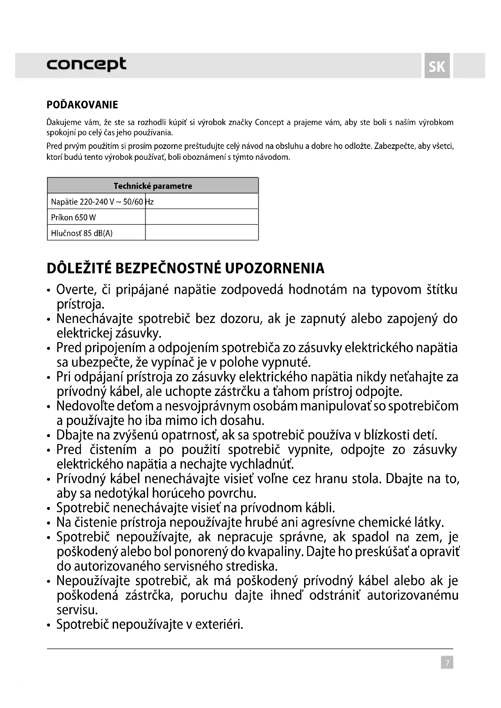 POĎAKOVANIE Ďakujeme vám, že ste sa rozhodli kúpiť si výrobok značky Concept a prajeme vám, aby ste boli s naším výrobkom spokojní po celý čas jeho používania. Pred prvým použitím si prosím pozorne preštudujte celý návod naobsluhu a dobre ho odložte. Zabezpečte, aby všetci, ktorí budú tento výrobok používať, boli oboznámení stýmto návodom. Technické parametre Napätie 220-240 V ~ 50/60 Hz Príkon 650 W Hlučnosť 85 dB(A)