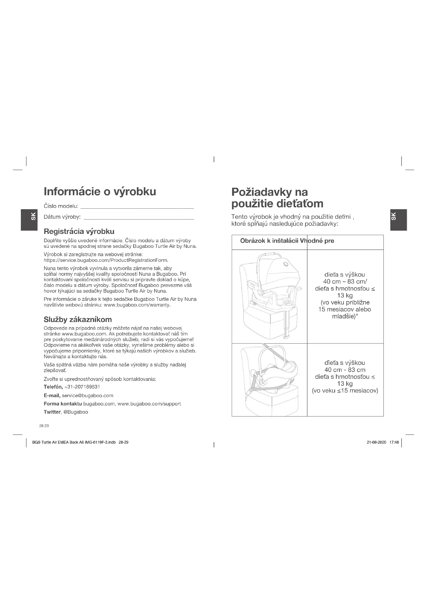 BGB Turtle Air EMEA Book A6 IMG-0119F-3.indb 26-27BGB Turtle Air EMEA Book A6 IMG-0119F-3.indb 26-27 21-08-2020 17:4821-08-2020 17:48Informácie o výrobku Číslo modelu: ________________________________________ Dátum výroby: _______________________________________ Registrácia výrobku Doplňte vyššie uvedené informácie. Číslo modelu a dátum výroby sú uvedené na spodnej strane sedačky Bugaboo Turtle Air by Nuna. Výrobok si zaregistrujte na webovej stránke: https://service.bugaboo.com/ProductRegistrationForm. Nuna tento výrobok vyvinula a vytvorila zámerne tak, aby spĺňal normy najvyššej kvality spoločností Nuna a Bugaboo. Pri kontaktovaní spoločnosti kvôli servisu si pripravte doklad o kúpe, číslo modelu a dátum výroby. Spoločnosť Bugaboo prevezme váš hovor týkajúci sa sedačky Bugaboo Turtle Air by Nuna. Pre informácie o záruke k tejto sedačke Bugaboo Turtle Air by Nuna navštívte webovú stránku: www.bugaboo.com/warranty. Služby zákazníkom Odpovede na prípadné otázky môžete nájsť na našej webovej stránke www.bugaboo.com. Ak potrebujete kontaktovať náš tím pre poskytovanie medzinárodných služieb, radi si vás vypočujeme! Odpovieme na akékoľvek vaše otázky, vyriešime problémy alebo si vypočujeme pripomienky, ktoré sa týkajú našich výrobkov a služieb. Neváhajte a kontaktujte nás. Vaša spätná väzba nám pomáha naše výrobky a služby naďalej zlepšovať. Zvoľte si uprednostňovaný spôsob kontaktovania: Telefón, +31-207189531 E-mail, service@bugaboo.com Forma kontaktu bugaboo.com, www.bugaboo.com/support Twitter, @Bugaboo Požiadavky na použitie dieťaťom Obrázok k inštalácii Vhodné pre dieťa s výškou 40 cm – 83 cm/ dieťa s hmotnosťou ≤ 13 kg (vo veku približne 15 mesiacov alebo mladšie)" ďieťa s výškou 40 cm - 83 cm dieťa s hmotnosťou ≤ 13 kg (vo veku ≤15 mesiacov) Tento výrobok je vhodný na použitie deťmi , ktoré spĺňajú nasledujúce požiadavky: