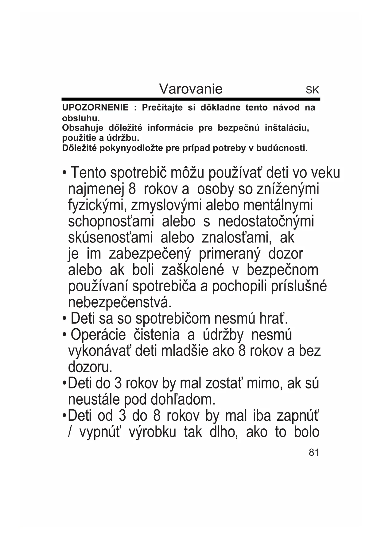 - Tento spotrebič môžu používať deti vo veku najmenej 8 rokov a osoby so zníženými fyzickými, zmyslovými alebo mentálnymi schopnosťami alebo s nedostatočnými skúsenosťami alebo znalosťami, ak je im zabezpečený primeraný dozor alebo ak boli zaškolené v bezpečnom používaní spotrebiča a pochopili príslušné nebezpečenstvá.