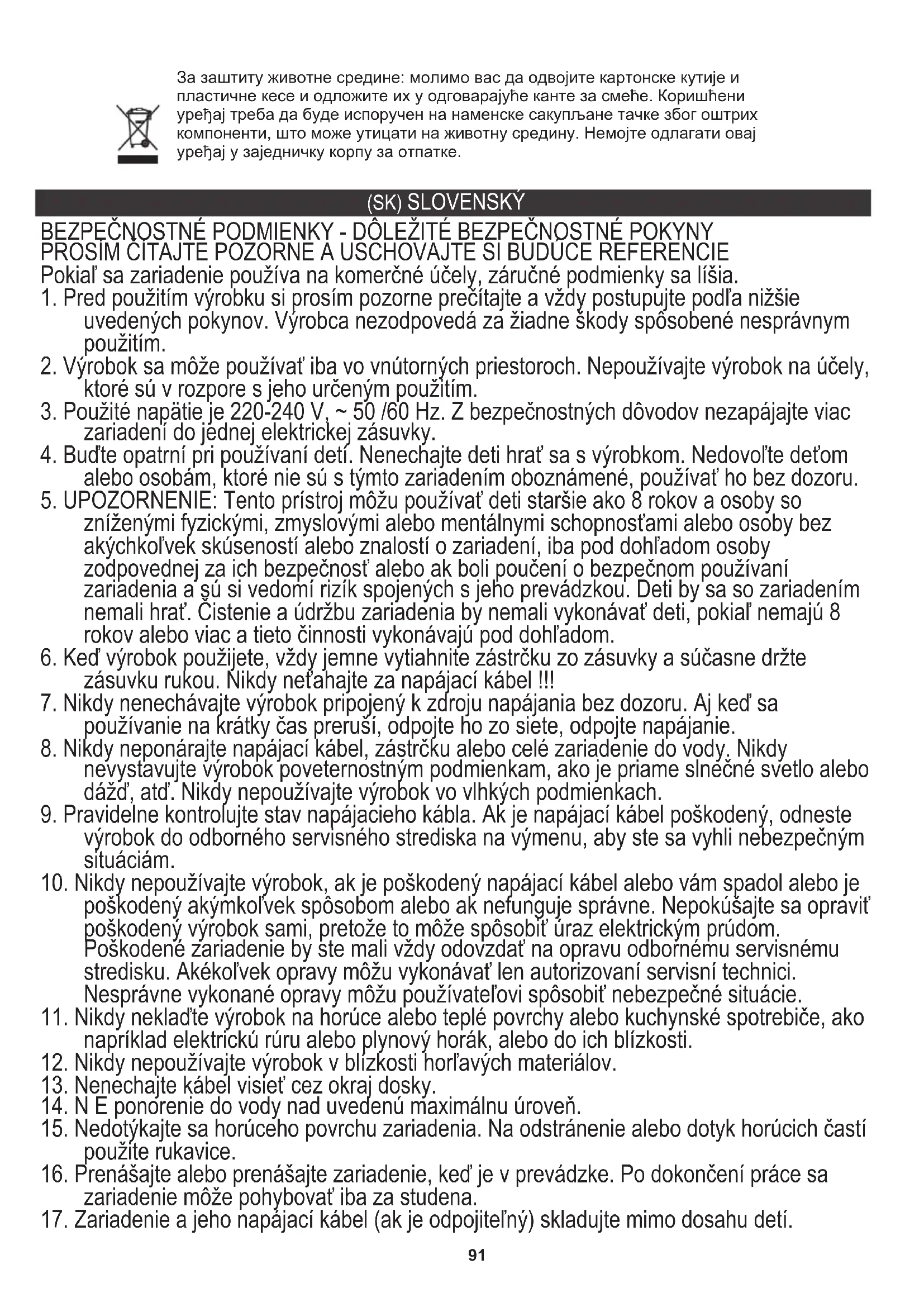 Po niekoľkých použitiach môže byť vykurovací článok pokrytý minerálnymi usadeninami z vody. Je to normálne a môže sa to vyskytnúť častejšie v závislosti od minerálov v použitej vode. Pri čistení minerálov na vykurovacom telese postupujte podľa nižšie uvedených pokynov. Presný sporák upnite do žiaruvzdornej nádoby. Naplňte nádobu maximálnym ryskom (MAX) uvedeným na kryte prvku z nehrdzavejúcej ocele rovnakým množstvom vody a bieleho octu. Pripojte napájací kábel. Nastavte cieľovú teplotu na 70 ° C / 158 ° F a nastavte časovač na 20 minút. Zariadenie spustíte stlačením tlačidla Hviezdička / Pozastaviť (C5) . Po dokončení práce odpojte napájací kábel, aby ste zariadenie vypli a nechali ho vychladnúť. Vylejte vodu z nádoby, opláchnite kryt vložky a vnútorné časti studenou vodou. Pred skladovaním dôkladne osušte. Technické dáta: Výkon: 1200 W Napätie: 220-240V 50/60 Hz Maximálne množstvo vody v nádobe: 20 l95