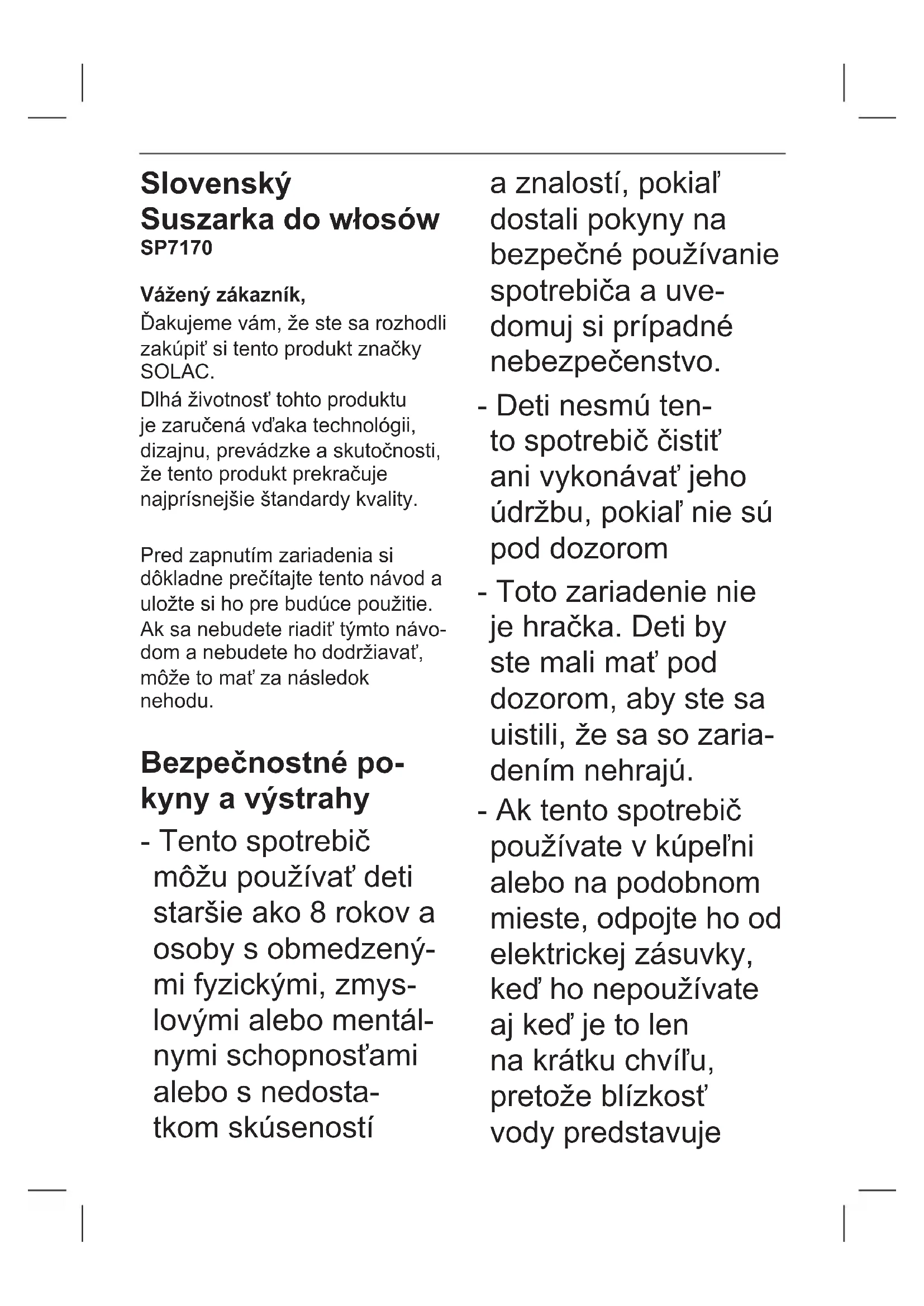 ODPADAMI - Materiały, z których wyko- nane jest opakowanie tego urządzenia, znajdują się w ramach systemu zbierania, klasykacji oraz ich odzysku. Jeżeli chcecie Państwo się ich pozbyć, należy umieścić je w kontenerze przeznaczonym do tego typu materiałów. - Produkt nie zawiera koncen- tracji substancji, które mogłyby być uznane za szkodliwe dla środowiska. Symbol ten oznacza, że jeśli chcecie się Państwo pozbyć tego produktu po zakończeniu okresu jego użytkowania, należy go przekazać przy zastosowaniu określonych środków do autoryzowanego podmiotu zarządzającego odpadami w celu przeprowadzenia selektyw- nej zbiórki Odpadów Urządzeń Elektrycznych i Elektronicznych (WEEE). - To urządzenie jest zgodne z dyrektywą 2014/35/EU niskonapięciowych 2014/30/EU o Kompatybilność elektromag- netycznej, z dyrektywą 2011/65/ EU w sprawie ograniczenia stosowania niektórych niebez- piecznych substancji w sprzęcie elektrycznym i elektronicznym oraz dyrektywą 2009/125/EC w sprawie wymogów dotyczących ekoprojektu stosowanego w produktach związanych z energią.Slovenský Suszarka do włosów SP7170 Vážený zákazník, Ďakujeme vám, že ste sa rozhodli zakúpiť si tento produkt značky SOLAC. Dlhá životnosť tohto produktu je zaručená vďaka technológii, dizajnu, prevádzke a skutočnosti, že tento produkt prekračuje najprísnejšie štandardy kvality. Pred zapnutím zariadenia si dôkladne prečítajte tento návod a uložte si ho pre budúce použitie. Ak sa nebudete riadiť týmto návo- dom a nebudete ho dodržiavať, môže to mať za následok nehodu. Bezpečnostné po- kyny a výstrahy - Tento spotrebič môžu používať deti staršie ako 8 rokov a osoby s obmedzený- mi fyzickými, zmys- lovými alebo mentál- nymi schopnosťami alebo s nedosta- tkom skúseností a znalostí, pokiaľ dostali pokyny na bezpečné používanie spotrebiča a uve- domuj si prípadné nebezpečenstvo. - Deti nesmú ten- to spotrebič čistiť ani vykonávať jeho údržbu, pokiaľ nie sú pod dozorom - Toto zariadenie nie je hračka. Deti by ste mali mať pod dozorom, aby ste sa uistili, že sa so zaria- dením nehrajú. - Ak tento spotrebič používate v kúpeľni alebo na podobnom mieste, odpojte ho od elektrickej zásuvky, keď ho nepoužívate aj keď je to len na krátku chvíľu, pretože blízkosť vody predstavujenebezpečenstvo, keď je spotrebič odpo- jený. - Ako dodatočná ochrana elektrického napájania spotrebiča je vhodné mať zaria- denie s rozdielovým prúdom s maxi- málnou citlivosťou 30 mA. Poraďte sa s oprávneným inštalatérom. - UPOZORNENIE: Tento spotrebič nepoužívajte v blí- zkosti vaní, spŕch, umývadiel alebo iných nádob, ktoré sú naplnené vodou. Tento symbol znamená, že toto zariadenie sa nesmie používať v blízkosti vody - Ak je zástrčka na pri- pojenie do elektrickej zásuvky poškodená, zariadenie odnes- te do servisného strediska, kde ju musia vymeniť. Nepokúšajte sa sami rozoberať alebo opravovať toto zariadenie, pretože to môže byť nebezpečné. - Pred pripojením zariadenia ku zdroju napájania skontrolujte, či napätie uvedené na typovom štítku zodpovedá napätiu v elektrickej zásuvke. - Zariadenie zapojte do elektrickej zásuvky pre menovité napätie minimálne 16 ampérov. - Zástrčka zariadenia musí správne zapadnúť do elektrickej zásuvky. Zástrčku neupravujte. Nepoužívajte zásuvkové adap- téry. - Veko tlakového hrnca neotvá- rajte násilím. Zariadenie neprenášajte, nezdvíhajte ani neodpájajte ťahaním za napája- cí kábel. - Napájací kábel neomotávajte okolo spotrebiča. - Napájací kábel nezopínajte ani nezohýnajte. - Zabráňte, aby napájací kábelprevísal cez horúce povrchy spotrebiča alebo bol s nimi v kontakte. - Skontrolujte stav napájacie- ho kábla. Poškodené alebo zamotané káble zvyšujú nebezpečenstvo úrazu elektric- kým prúdom. - Zástrčky sa nedotýkajte mokrý- mi rukami. - Zariadenie nepoužívajte, ak je poškodený kábel alebo zástrčka. - Ak je na zariadení poškodený niektorý z krytov, okamžite ho odpojte od elektrickej zásuvky, aby sa zabránilo možnosti úrazu elektrickým prúdom. - Zariadenie nepoužívajte, ak spadlo na zem, ak vykazuje viditeľné znaky poškodenia alebo ak netesní. - UPOZORNENIE: Spotrebič udržiavajte v suchom stave. - Zariadenie nepoužívajte, ak máte mokré ruky alebo nohy, alebo keď ste bosý. - Napájací kábel musí byť pravidelne kontrolovaný a ak je poškodený, zariadenie sa nesmie používať. - Prístupné plochy môžu byť počas prevádzky horúce. - Keď je spotrebič zapnutý, nepoužívajte spreje na vlasy ani iné produkty v spreji. - UPOZORNENIE: Zariadenie nezakrývajte, aby nedošlo k jeho prehriatiu. - Vstupné a výstupné otvory pre vzduch nesmú byť čiastočne ani úplne zakryté závesmi, odevmi a podobne, pretože to zvyšuje nebezpečenstvo požiaru.