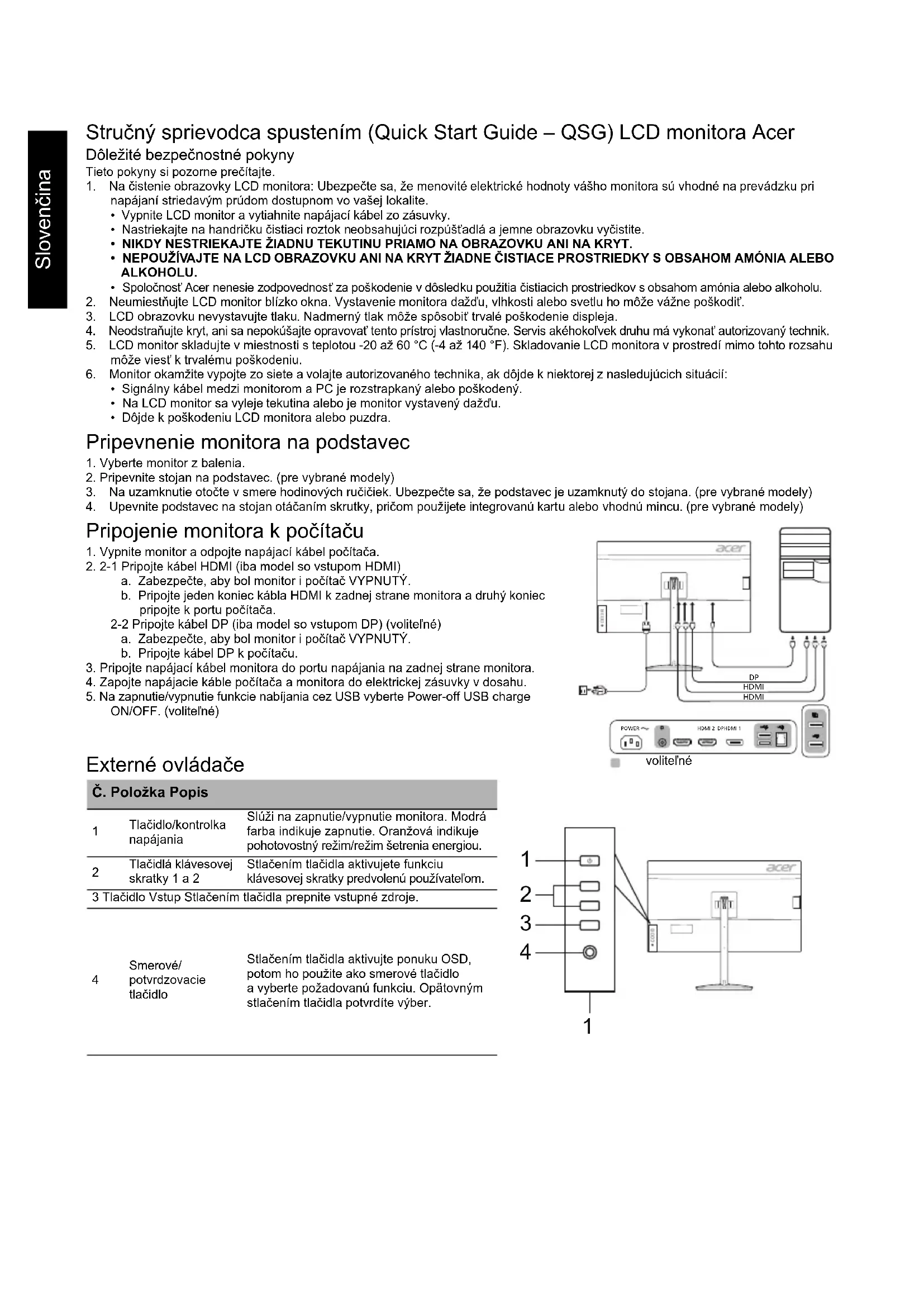 Kontrast 100000000:1 Max (ACM) Pozorovací uhol 178° (H) 178° (V) (CR = 10) Doba odozvy 1 ms (G ku G) / 0,5 ms (G ku G, min.) Typ panela IPS Horizontálna frekvencia HDMI: 31 - 222 kHz / DP: 31 - 395 kHz Vertikálna frekvencia HDMI: 56 - 144 Hz / DP: 56 - 270 Hz Farby displeja 16,7 milióna Max. obnovovacia frekvencia bodov HDMI: 595,5 MHz / DP: 1056,97 MHz Maximálne rozlíšenie HDMI: 2560 x 1440 pri 144 Hz / DP: 2560 x 1440 pri 240 Hz DP: 2560 x 1440 pri 270 Hz (s funkciou Pretaktovanie na možnosti Zapnúť) Technológia Plug & Play VESA DDCCI/DDC2B Trieda energetickej účinnosti C *Ročná spotreba energie 86 (kWh) (pre model so vstupom HDMI) Spotreba energie (pri 200 nitov) Režim zapnutia 45 W (charakteristicky) Režim spánku 0,45 W (charakteristicky) Režim vypnutia 0,3 W (charakteristicky) Vstupný konektor HDMI (iba model so vstupom HDMI) / DP (iba model so vstupom DP) Vstupný signál videa HDMI (iba model so vstupom HDMI) (voliteľné) / DP (iba model so vstupom DP) (voliteľné) Reproduktory 2 W x 2 (iba model so vstupom Audio) (voliteľné) USB USB 3.0 x 4 (voliteľné) Maximálna veľkosť obrazovky Horizontálne: 708,4 mm Vertikálne: 398,5 mm Zdroj napájania 100-240 V, 50/60 Hz Podmienky prostredia Prevádzková teplota: 0 až 40 °C Teplota skladovania: -20 až 60 °C Prevádzková vlhkosť: 20 % až 80 % Rozmery 727,48 (š) x 479,18 ~ 609,18 (v) x 269 (h) mm Hmotnosť (netto) 9,5 kg (netto) Špecifikácie mechanizmu Vyklopenie: -5° až +35° (iba v najvyššom bode možno ponúknuť 35 stupňov zaklopenia pre uhol elevácie) Otáčanie: 360° Nastavenie výšky: 0 mm až 130 mm Vyklápanie: Nie Odpojiteľný stojan: Áno Vonkajšie ovládače Prepínač/Tlačidlá Tlačidlo zapnutia Tlačidlo klávesovej skratky 1 Tlačidlo klávesovej skratky 2 Vstup Ponuka/Smerové/Potvrdzovacie Funkcie Jas Kontrast Modré svetlo Zvýraznenie čiernej ACM HDR*** Zvýšená ostrosť Gama Teplota farieb Režimy Priestor farieb Režim odtieňov sivej 6-osový odtieň 6-osová sýtosť Hlasitosť Stlmiť Pretaktovanie FreeSync Premium** Hodnota obnovovacej frekvencie Ultra nízke oneskorenie Mieridlo Jazyk Časový limit OSD Transparentnosť Zámok OSD Vstup Automatický zdroj Formát DP Priradenie kláv. skratiek Širokouhlé PIP/PBP DDC/CI Úroveň čiernej na HDMI Režim rýchleho spustenia Pretaktovanie# Nabíjanie USB pri vypnutí Informácie o displeji Obnoviť všetky nastavenia Ukončiť Parametre sa líšia v závislosti od modelu a/alebo oblasti.Dansk Guide til hurtig opstart af LCD-skærm fra Acer Vigtige sikkerhedsinstruktioner Læs følgende instruktioner grundigt. 1. Sådan rengøres LCD-skærmen: Sørg for, at skærmen er elektrisk klassificeret til at fungere med den tilgængelige vekselstrøm, hvor du befinder dig.• Sluk for LCD-skærmen, og tag netledningen ud.