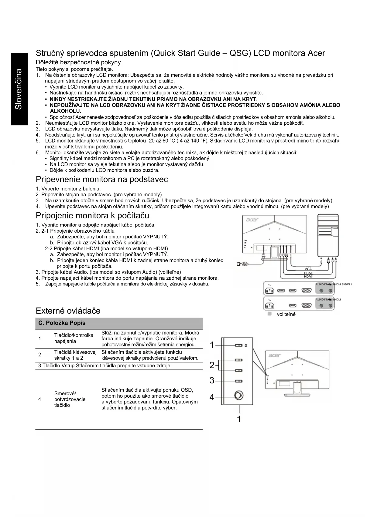 (charakteristický) Kontrast 100000000:1 Max (ACM) Pozorovací uhol 178° (H) 178° (V) (CR = 10) Doba odozvy 1 ms (VRB) Video Analógové rozhranie R, G, B Typ panela VA Horizontálna frekvencia 30 - 85 kHz Vertikálna frekvencia 56 - 76 Hz Farby displeja 16,7 milióna Max. obnovovacia frekvencia bodov 174,5 MHz Maximálne rozlíšenie VGA: 1920 x 1080 pri 75 Hz HDMI: 1920 x 1080 pri 75 Hz Technológia Plug & Play VESA DDCCI/DDC2B Spotreba energie (pri 200 nitov) Režim zapnutia 26 W Režim spánku 0,5 W Režim vypnutia 0,3 W Vstupný konektor D-Sub HDMI (iba model so vstupom HDMI) Vstupný signál videa Analógový: 0,7 Vp-p (štandardne), 75 OHM, kladný HDMI (iba model so vstupom HDMI) (voliteľné) Reproduktory 2 W x 2 (iba model so vstupom Audio) (voliteľné) Maximálna veľkosť obrazovky Horizontálne: 597,6 mm Vertikálne: 336,1 mm Zdroj napájania 100 – 240 V, 50/60 Hz Podmienky prostredia Prevádzková teplota: 0 až 40 °C Teplota skladovania: -20 až 60 °C Prevádzková vlhkosť: 20 % až 80 % Rozmery 614,3 (š) x 440,62 (v) x 248,98 (h) mm Hmotnosť (netto) 5,4 kg (netto) Špecifikácie mechanizmu Vyklopenie: -5° až +20° Otáčanie: Nie Nastavenie výšky: Nie Vyklápanie: Nie Odpojiteľný stojan: Áno Vonkajšie ovládače Prepínač/Tlačidlá Tlačidlo zapnutia Tlačidlo klávesovej skratky 1 Tlačidlo klávesovej skratky 2 Vstup Ponuka/Smerové/Potvrdzovacie Funkcie Jas Kontrast Modré svetlo Zvýraznenie čiernej ACM Zvýšená ostrosť Horizontálna poloha (iba pre model s analógovým vstupom) Vertikálna poloha (iba pre model s analógovým vstupom) Hodiny (iba pre model s analógovým vstupom) Ohnisko (iba pre model s analógovým vstupom) Automatická konfigurácia (iba pre model s analógovým vstupom) Gama Teplota farieb Režimy Režim sRGB Režim odtieňov sivej 6-osový odtieň 6-osová sýtosť Hlasitosť Stlmiť Pretaktovanie FreeSync Hodnota obnovovacej frekvencie VRB Jazyk Časový limit OSD Transparentnosť Zámok OSD Vstup Automatický zdroj Priradenie kláv. skratiek Širokouhlé DDC/CI Úroveň čiernej na HDMI Režim rýchleho spustenia Informácie o displeji Obnoviť všetky nastavenia Ukončiť Parametre sa líšia v závislosti od modelu a/alebo oblasti.Dansk Guide til hurtig opstart af LCD-skærm fra Acer Vigtige sikkerhedsinstruktioner Læs følgende instruktioner grundigt. 1. Sådan rengøres LCD-skærmen: Sørg for, at skærmen er elektrisk klassificeret til at fungere med den tilgængelige vekselstrøm, hvor du befinder dig.• Sluk for LCD-skærmen, og tag netledningen ud.