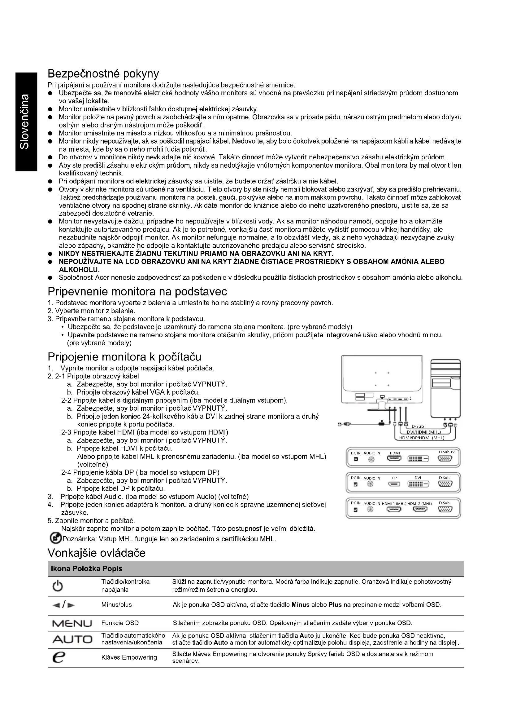 Όλες οι προδιαγραφές υπόκεινται σε αλλαγές χωρίς προειδοποίηση.Slovenčina Bezpečnostné pokyny Pri pripájaní a používaní monitora dodržujte nasledujúce bezpečnostné smernice: Ubezpečte sa, že menovité elektrické hodnoty vášho monitora sú vhodné na prevádzku pri napájaní striedavým prúdom dostupnom vo vašej lokalite. Monitor umiestnite v blízkosti ľahko dostupnej elektrickej zásuvky. Monitor položte na pevný povrch a zaobchádzajte s ním opatrne. Obrazovka sa v prípade pádu, nárazu ostrým predmetom alebo dotyku ostrým alebo drsným nástrojom môže poškodiť. Monitor umiestnite na miesto s nízkou vlhkosťou a s minimálnou prašnosťou. Monitor nikdy nepoužívajte, ak sa poškodil napájací kábel. Nedovoľte, aby bolo čokoľvek položené na napájacom kábli a kábel nedávajte na miesta, kde by sa o neho mohli ľudia potknúť. Do otvorov v monitore nikdy nevkladajte nič kovové. Takáto činnosť môže vytvoriť nebezpečenstvo zásahu elektrickým prúdom. Aby ste predišli zásahu elektrickým prúdom, nikdy sa nedotýkajte vnútorných komponentov monitora. Obal monitora by mal otvoriť len kvalifikovaný technik. Pri odpájaní monitora od elektrickej zásuvky sa uistite, že budete držať zástrčku a nie kábel. Otvory v skrinke monitora sú určené na ventiláciu. Tieto otvory by ste nikdy nemali blokovať alebo zakrývať, aby sa predišlo prehrievaniu. Taktiež predchádzajte používaniu monitora na posteli, gauči, pokrývke alebo na inom mäkkom povrchu. Takáto činnosť môže zablokovať ventilačné otvory na spodnej strane skrinky. Ak dáte monitor do knižnice alebo do iného uzatvoreného priestoru, uistite sa, že sa zabezpečí dostatočné vetranie. Monitor nevystavujte dažďu, prípadne ho nepoužívajte v blízkosti vody. Ak sa monitor náhodou namočí, odpojte ho a okamžite kontaktujte autorizovaného predajcu. Ak je to potrebné, vonkajšiu časť monitora môžete vyčistiť pomocou vlhkej handričky, ale nezabudnite najskôr odpojiť monitor. Ak monitor nefunguje normálne, a to obzvlášť vtedy, ak z neho vychádzajú nezvyčajné zvuky alebo zápachy, okamžite ho odpojte a kontaktujte autorizovaného predajcu alebo servisné stredisko. NIKDY NESTRIEKAJTE ŽIADNU TEKUTINU PRIAMO NA OBRAZOVKU ANI NA KRYT. NEPOUŽÍVAJTE NA LCD OBRAZOVKU ANI NA KRYT ŽIADNE ČISTIACE PROSTRIEDKY S OBSAHOM AMÓNIA ALEBO ALKOHOLU. Spoločnosť Acer nenesie zodpovednosť za poškodenie v dôsledku použitia čistiacich prostriedkov s obsahom amónia alebo alkoholu. Pripevnenie monitora na podstavec