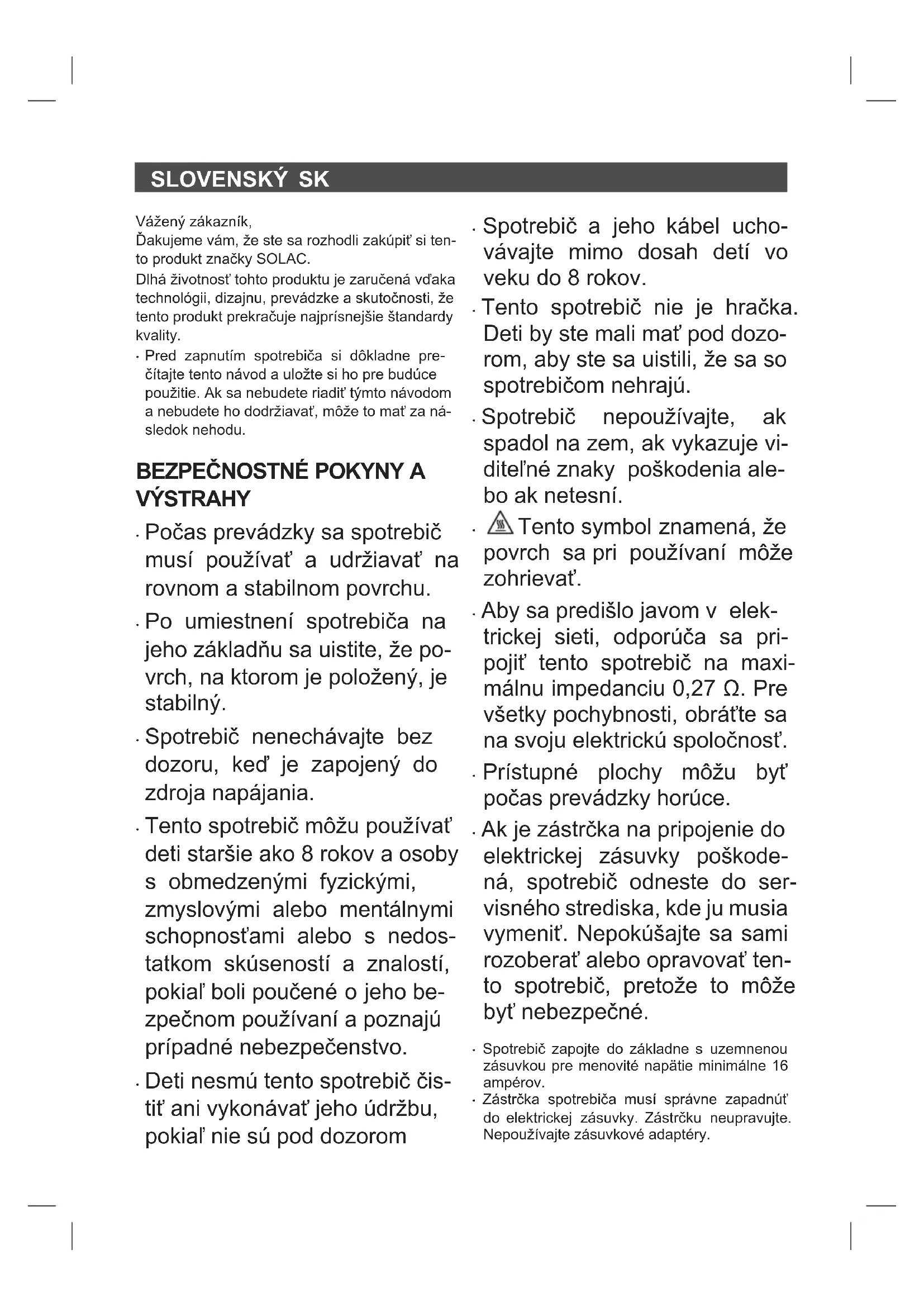 - Zástrčka spotrebiča musí správne zapadnúť do elektrickej zásuvky. Zástrčku neupravujte. Nepoužívajte zásuvkové adaptéry.SLOVENSKÝ SK
