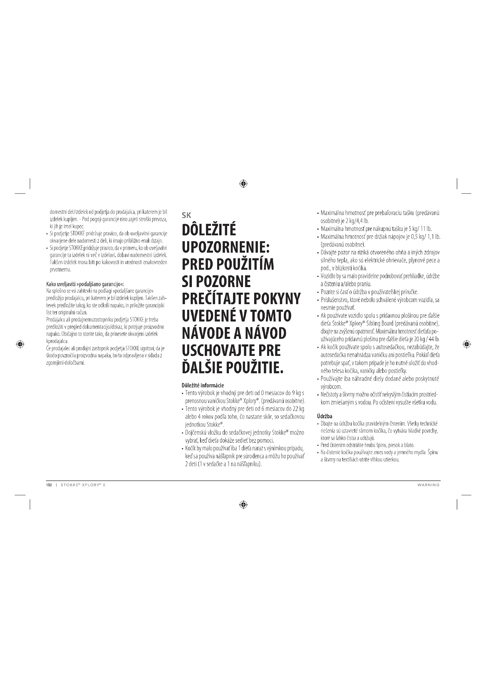 Akýkoľvek náklad pripevnený k rukoväti a/alebo na zadnej strane operadla a/alebo na bokoch kočíka ovplyvňuje jeho stabilitu. Právo na reklamáciu a predĺžená záruka Platí na celom svete vo vzťahu k výrobku Stokke® Xplory® X, ktorý sa v ďalšom texte označuje ako výrobok..