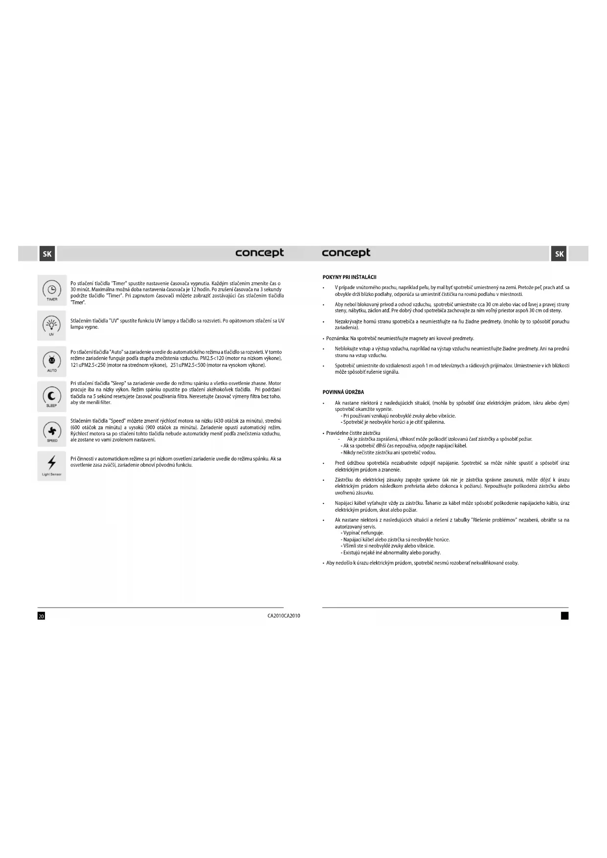 CA2010 Poďakovanie Ďakujeme vám, že ste sa rozhodli kúpiť si výrobok značky Concept a prajeme vám, aby ste boli s naším výrobkom spokojní po celý čas jeho používania. Pred prvým použitím si prosím pozorne preštudujte celý návod naobsluhu a dobre ho odložte. Zabezpečte, aby všetci, ktorí budú tento výrobok používať, boli oboznámení stýmto návodom. Technické parametre Napätie 220-240 V ~ 50 Hz Príkon 85 W Hlučnosť 30-60 dB