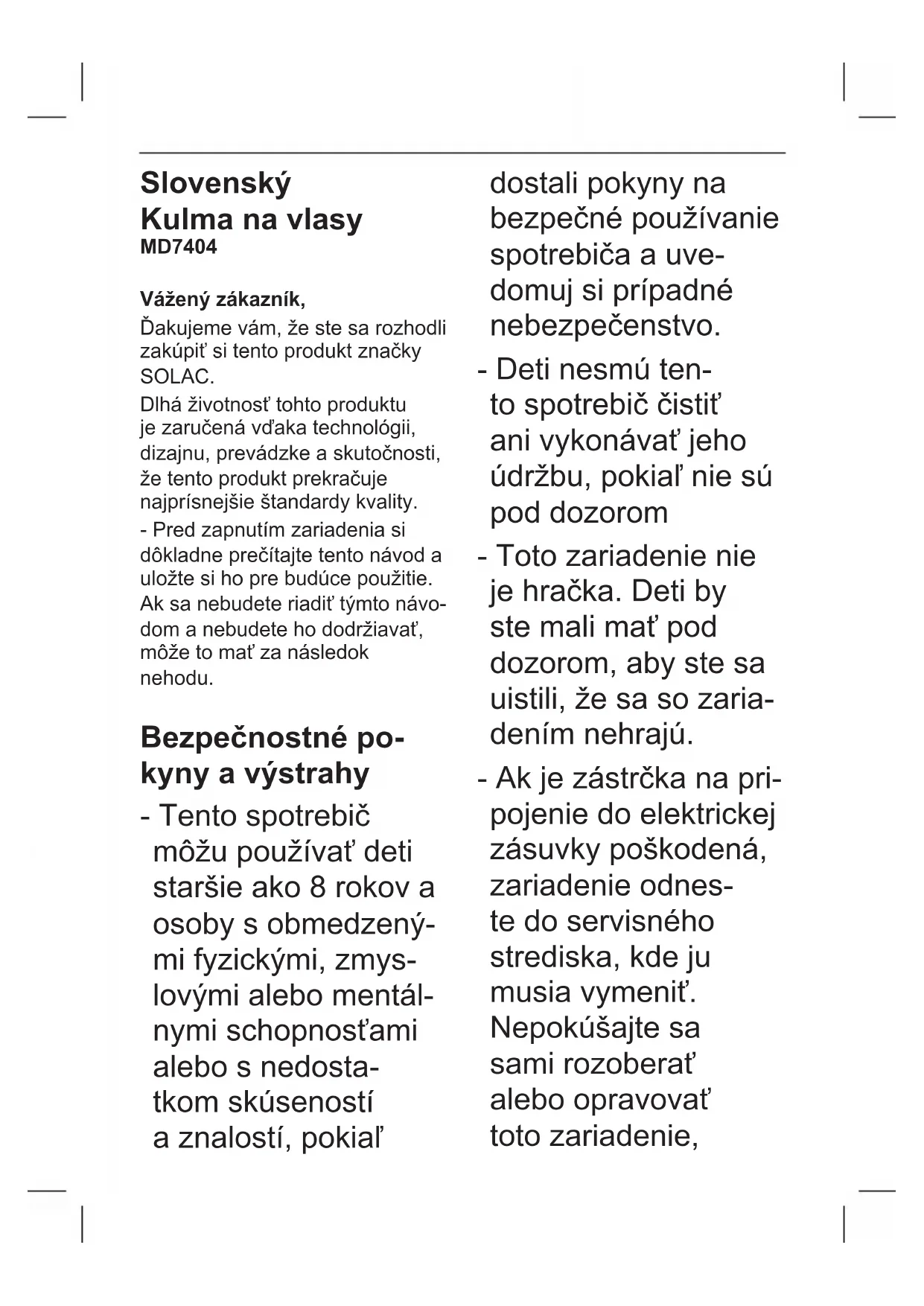 ODPADAMI - Materiały, z których wyko- nane jest opakowanie tego urządzenia, znajdują się w ramach systemu zbierania, klasykacji oraz ich odzysku. Jeżeli chcecie Państwo się ich pozbyć, należy umieścić je w kontenerze przeznaczonym do tego typu materiałów. - Produkt nie zawiera koncen- tracji substancji, które mogłyby być uznane za szkodliwe dla środowiska. Symbol ten oznacza, że jeśli chcecie się Państwo pozbyć tego produktu po zakończeniu okresu jego użytkowania, należy go przekazać przy zastosowaniu określonych środków do autoryzowanego podmiotu zarządzającego odpadami w celu przeprowadzenia selektyw- nej zbiórki Odpadów Urządzeń Elektrycznych i Elektronicznych (WEEE). Urządzenie spełniające wymogi Ustawy 2014/35/EC o Niskim Napięciu, Ustawy 2014/30/EC o Zgodności Elektromagne- tycznej, Ustawy 2011/65/EC o gospodarce odpadami elektrycz- nymi i elektronicznymi i ustawy 2009/125/EC o urządzeniach konsumujących energię.Slovenský Kulma na vlasy MD7404 Vážený zákazník, Ďakujeme vám, že ste sa rozhodli zakúpiť si tento produkt značky SOLAC. Dlhá životnosť tohto produktu je zaručená vďaka technológii, dizajnu, prevádzke a skutočnosti, že tento produkt prekračuje najprísnejšie štandardy kvality. - Pred zapnutím zariadenia si dôkladne prečítajte tento návod a uložte si ho pre budúce použitie. Ak sa nebudete riadiť týmto návo- dom a nebudete ho dodržiavať, môže to mať za následok nehodu. Bezpečnostné po- kyny a výstrahy - Tento spotrebič môžu používať deti staršie ako 8 rokov a osoby s obmedzený- mi fyzickými, zmys- lovými alebo mentál- nymi schopnosťami alebo s nedosta- tkom skúseností a znalostí, pokiaľ dostali pokyny na bezpečné používanie spotrebiča a uve- domuj si prípadné nebezpečenstvo. - Deti nesmú ten- to spotrebič čistiť ani vykonávať jeho údržbu, pokiaľ nie sú pod dozorom - Toto zariadenie nie je hračka. Deti by ste mali mať pod dozorom, aby ste sa uistili, že sa so zaria- dením nehrajú. - Ak je zástrčka na pri- pojenie do elektrickej zásuvky poškodená, zariadenie odnes- te do servisného strediska, kde ju musia vymeniť. Nepokúšajte sa sami rozoberať alebo opravovať toto zariadenie,pretože to môže byť nebezpečné. - UPOZORNENIE: Tento spotrebič nepoužívajte v blí- zkosti vaní, spŕch, umývadiel alebo iných nádob, ktoré sú naplnené vodou. Tento symbol znamená, že toto zariadenie sa nesmie používať v blízkosti vody - Pred pripojením zariadenia ku zdroju napájania skontrolujte, či napätie uvedené na typovom štítku zodpovedá napätiu v elektrickej zásuvke. - Zariadenie zapojte do elektrickej zásuvky pre menovité napätie minimálne 10 ampérov. - Zástrčka zariadenia musí správne zapadnúť do elektrickej zásuvky. Zástrčku neupravujte. Nepoužívajte zásuvkové adap- téry. - Veko tlakového hrnca neotvá- rajte násilím. Zariadenie neprenášajte, nezdvíhajte ani neodpájajte ťahaním za napája- cí kábel. - Zabráňte, aby napájací kábel prevísal cez horúce povrchy spotrebiča alebo bol s nimi v kontakte. - Zástrčky sa nedotýkajte mokrý- mi rukami. - Zariadenie nepoužívajte, ak je poškodený kábel alebo zástrčka. - Ak je na zariadení poškodený niektorý z krytov, okamžite ho odpojte od elektrickej zásuvky, aby sa zabránilo možnosti úrazu elektrickým prúdom. - Zariadenie nepoužívajte, ak spadlo na zem, ak vykazuje viditeľné znaky poškodenia alebo ak netesní. - UPOZORNENIE: Spotrebič udržiavajte v suchom stave.