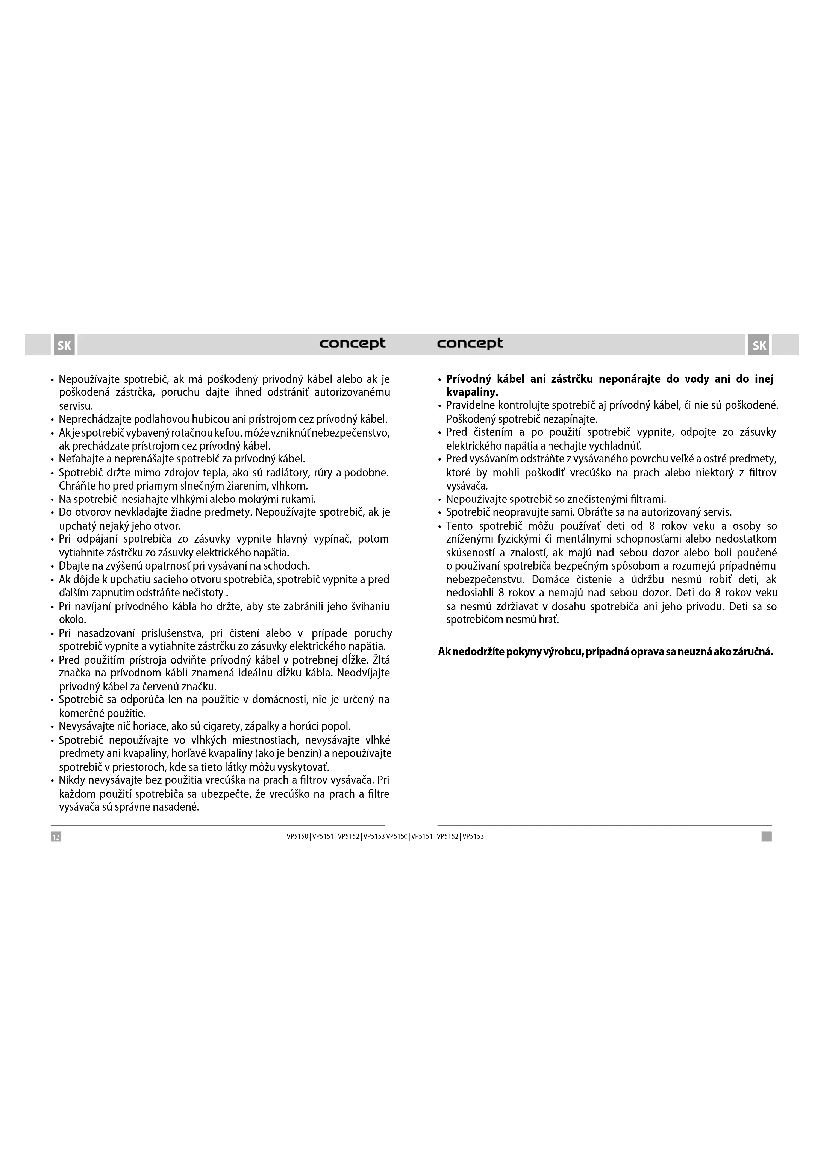 - Tento spotrebič môžu používať deti od 8 rokov veku a osoby so zníženými fyzickými či mentálnymi schopnosťami alebo nedostatkom skúseností a znalostí, ak majú nad sebou dozor alebo boli poučené opoužívaní spotrebiča bezpečným spôsobom a rozumejú prípadnému nebezpečenstvu. Domáce čistenie a údržbu nesmú robiť deti, ak nedosiahli 8 rokov a nemajú nad sebou dozor. Deti do 8 rokov veku sa nesmú zdržiavať v dosahu spotrebiča ani jeho prívodu. Deti sa so spotrebičom nesmú hrať. Ak nedodržíte pokyny výrobcu, prípadná oprava sa neuzná ako záručná.14 15 SKSK VP5150 | VP5151 | VP5152 | VP5153 VP5150 | VP5151 | VP5152 | VP5153