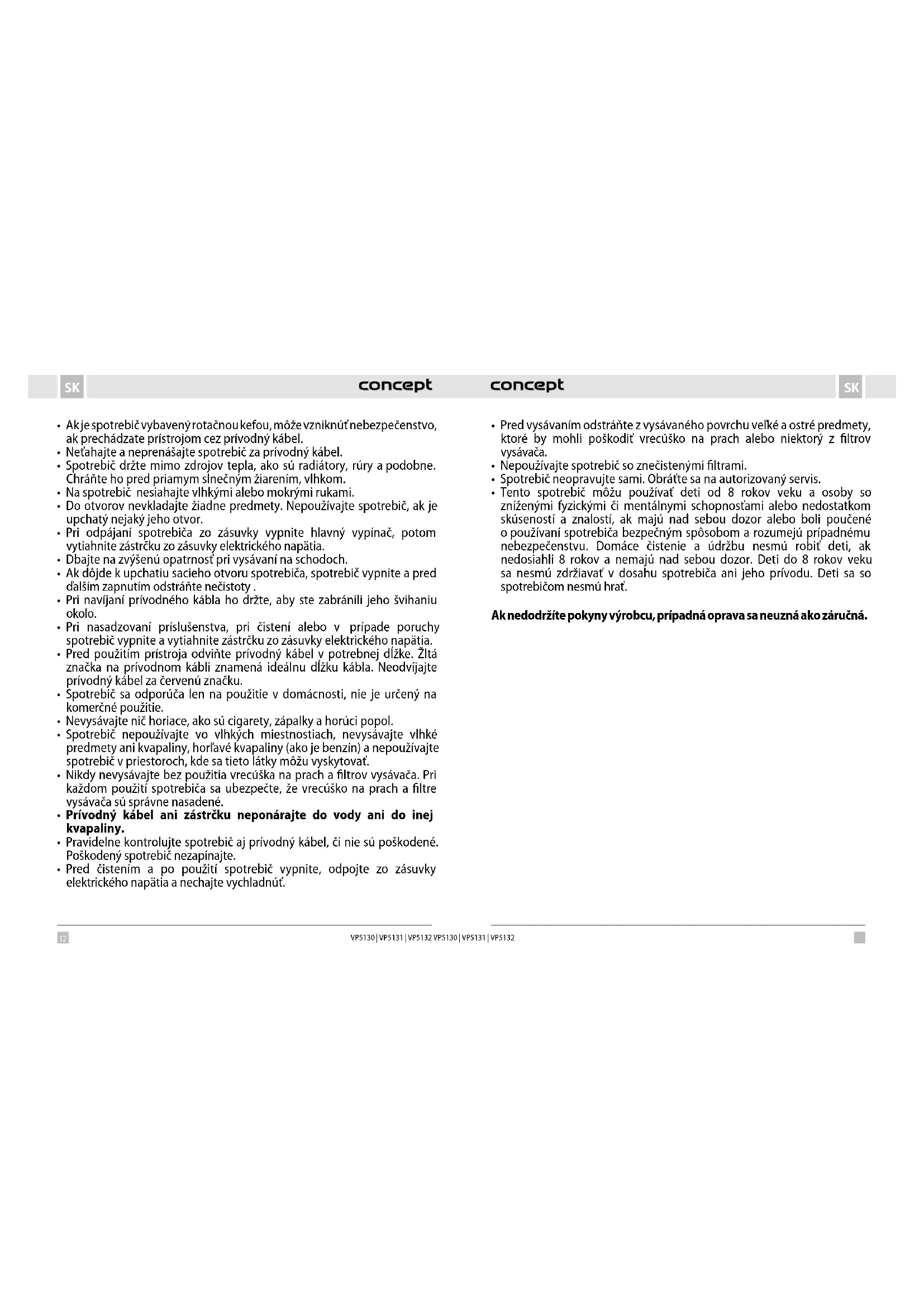 Právo na dodanie nového výrobku (výmenu), alebo výmenu súčasti výrobku má spotrebiteľ i v prípade odstrániteľnej vady, ak nemôže vec poriadne používať pre opakovaný výskyt vady po oprave alebo pre väčší počet vád. V takom prípade má spotrebiteľ i právo na vrátenie výrobku (odstúpenie od zmluvy). Ak nedôjde k vráteniu výrobku (odstúpeniu od zmluvy) alebo ak neuplatní spotrebiteľ právo na dodanie nového výrobku bez vád (výmenu), na výmenu jeho súčasti alebo na opravu výrobku, môže požadovať primeranú zľavu. Spotrebiteľ má právo na primeranú zľavu ivprípade, keď mu nemôže byť dodaný nový výrobok bez vád, vymenená súčasť výrobku alebo výrobok opravený, ako i v prípade, že nedôjde k zjednaniu nápravy v primeranej dobe alebo by zjednanie nápravy spotrebiteľovi spôsobilo značné problémy. Predávajúci, autorizované servisné stredisko, či nimi poverený pracovník, rozhodne o reklamácii ihneď, v zložitých prípadoch do troch pracovných dní. Do tejto lehoty sa nezapočítava doba primeraná podľa druhu výrobku potrebná k odbornému posúdeniu vady. Reklamácia vrátane odstránenia vady musí byť vybavená bez zbytočného odkladu, najneskôr do 30 dní odo dňa uplatnenia reklamácie, pokiaľ sa predávajúci alebo autorizované servisné stredisko vybavujúce reklamáciu so spotrebiteľom nedohodne na dlhšej lehote. Pri vrátení výrobku (odstúpení od zmluvy) je spotrebiteľ povinný vrátiť peniaze a tiež príslušenstvo výrobku a všetkých dokumentov dodaných svýrobkom. Spotrebiteľ nemá nárok na vydanie vadných dielov asúčastí výrobku, ktoré boli vymenené v rámci opravy výrobku. Všetky ďalšie práva spotrebiteľa, ktoré sa ku kúpe výrobku viažu, nie sú týmito záručnými podmienkami dotknuté. Pozn.: Reklamácia výrobku poškodeného pri preprave sa riadi reklamačným poriadkom prepravcu. Výrobce: Jindřich Valenta – Concept Vysokomýtská 1800, 565 01 Choceň Česká republika IČO 13216660 tel.: + 420 465 471 400, fax: +420 465 473 304 email: servis@my-concept.cz www: www.my-concept.com Distribútor: CONCEPT Slovensko s. r. o. Hurbanova 1563/23, 911 01 Trenčín Slovenská republika tel.: +421 326 583 465, fax: +421 326 583 466 email: info@my-concept.sk www: www.my-concept.sk Podrobnosti o produktu Model: Výrobné číslo: Dátum prodeja: Pečiatka a podpis prodejca:96 97 VP5130 | VP5131 | VP5132 VP5130 | VP5131 | VP5132 GWARANCJA Gwarancja Producent (lub importer) zapewnia, że produkt jest zgodny z wymogami prawnymi i spełnia odpowiednie normy techniczne. Produkt posiada właściwości, zawarte w dokumentacji produktowej, oczekiwane ze względu na charakter towaru oraz wskazane w re- klamie prowadzonej przez producenta. Producent zapewnia, że produkt nadaje się do celów konsumpcyjnych, do których ma zastosowanie lub do których stosuje się zwykle tego rodzaju produkt. Okres gwarancji wynosi 24 miesiące od daty otrzymania produktu przez konsumenta. Gwarancja nie obejmuje uszkodzeń mechanicznych spowodowanych użytkowaniem. Prawo gwarancji za wady rzeczy nie przysługuje, jeżeli klient wiedział przed zakupem, że produkt ma wadę lub usterkę lub sam ją spowodował. Gwarancja nie ma zastosowania w przypadkach, wktórych: