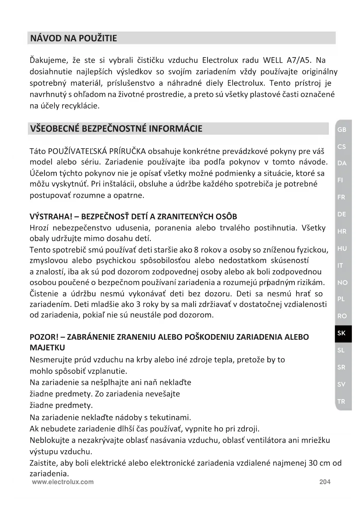 Pozorne si prečítajte tento návod a venujte osobitnú pozornosť bezpečnostným informáciám. Venujte osobitnú pozornosť oddielom s označením POZOR! Skontrolujte, či sú všetky kľúčové komponenty a opísané časti súčasťou balenia. www.electrolux.com 206KĽÚČOVÉ KOMPONENTY ČISTIČIEK VZDUCHU WELL SÉRIE A7/A5
