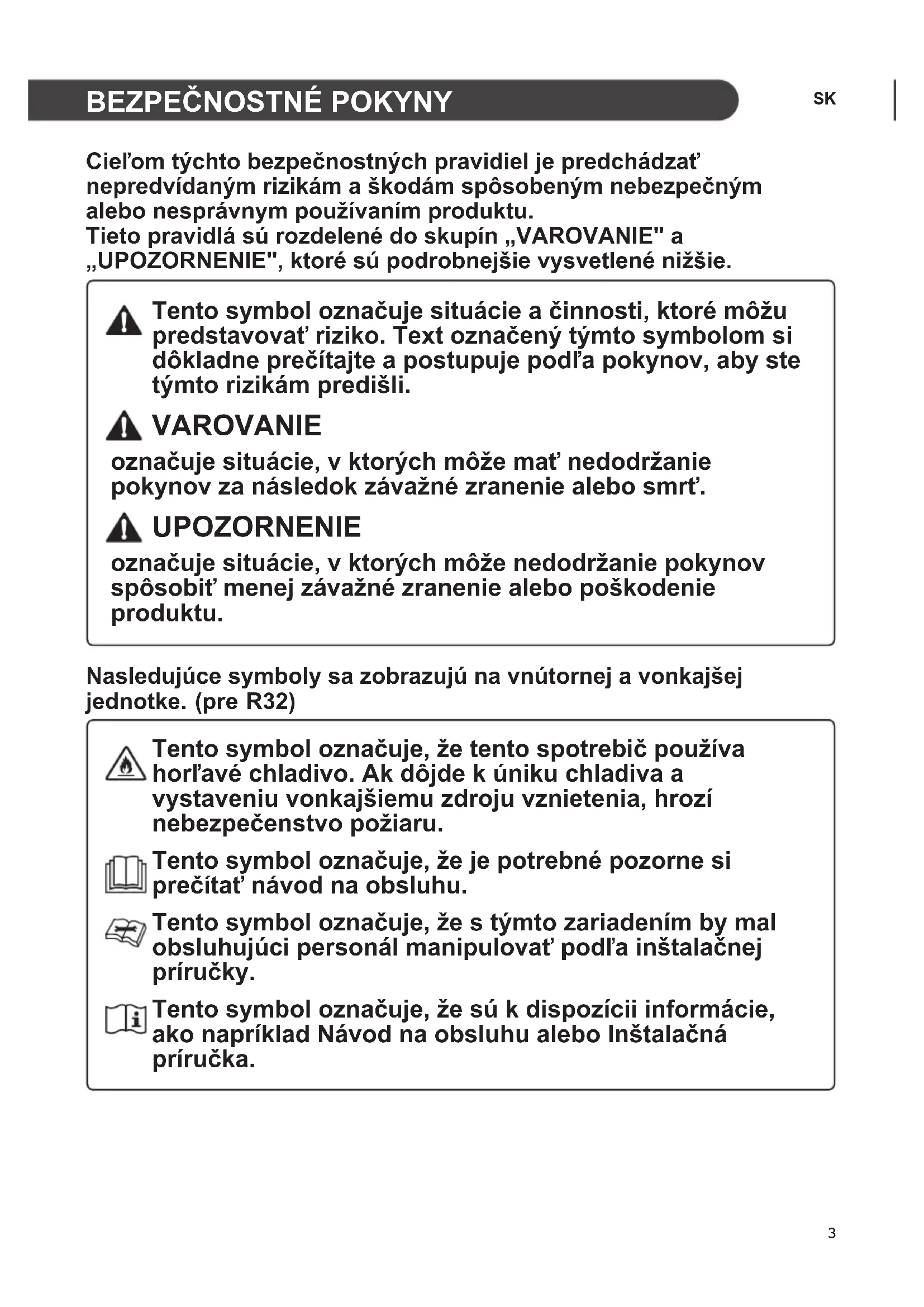 Cieľom týchto bezpečnostných pravidiel je predchádzať nepredvídaným rizikám a škodám spôsobeným nebezpečným alebo nesprávnym používaním produktu. Tieto pravidlá sú rozdelené do skupín „VAROVANIE" a „UPOZORNENIE", ktoré sú podrobnejšie vysvetlené nižšie. Tento symbol označuje situácie a činnosti, ktoré môžu predstavovať riziko. Text označený týmto symbolom si dôkladne prečítajte a postupuje podľa pokynov, aby ste týmto rizikám predišli. VAROVANIE označuje situácie, v ktorých môže mať nedodržanie pokynov za následok závažné zranenie alebo smrť. UPOZORNENIE označuje situácie, v ktorých môže nedodržanie pokynov spôsobiť menej závažné zranenie alebo poškodenie produktu. Nasledujúce symboly sa zobrazujú na vnútornej a vonkajšej jednotke. (pre R32) Tento symbol označuje, že tento spotrebič používa horľavé chladivo. Ak dôjde k úniku chladiva a vystaveniu vonkajšiemu zdroju vznietenia, hrozí nebezpečenstvo požiaru. Tento symbol označuje, že je potrebné pozorne si prečítať návod na obsluhu. Tento symbol označuje, že s týmto zariadením by mal obsluhujúci personál manipulovať podľa inštalačnej príručky. Tento symbol označuje, že sú k dispozícii informácie, ako napríklad Návod na obsluhu alebo Inštalačná príručka.4