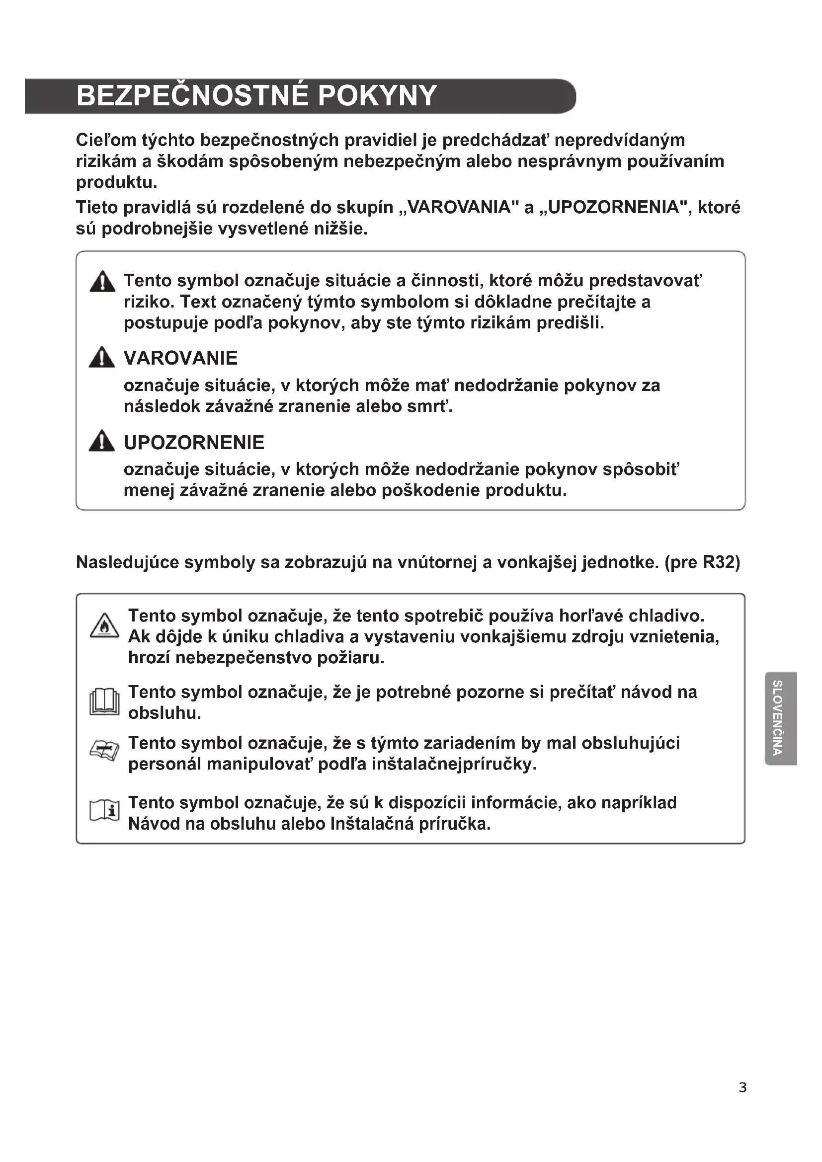 Cieľom týchto bezpečnostných pravidiel je predchádzať nepredvídaným rizikám a škodám spôsobeným nebezpečným alebo nesprávnym používaním produktu. Tieto pravidlá sú rozdelené do skupín „VAROVANIA" a „UPOZORNENIA", ktoré sú podrobnejšie vysvetlené nižšie. Tento symbol označuje situácie a činnosti, ktoré môžu predstavovať riziko. Text označený týmto symbolom si dôkladne prečítajte a postupuje podľa pokynov, aby ste týmto rizikám predišli. VAROVANIE označuje situácie, v ktorých môže mať nedodržanie pokynov za následok závažné zranenie alebo smrť. UPOZORNENIE označuje situácie, v ktorých môže nedodržanie pokynov spôsobiť menej závažné zranenie alebo poškodenie produktu. Nasledujúce symboly sa zobrazujú na vnútornej a vonkajšej jednotke. (pre R32) Tento symbol označuje, že tento spotrebič používa horľavé chladivo. Ak dôjde k úniku chladiva a vystaveniu vonkajšiemu zdroju vznietenia, hrozí nebezpečenstvo požiaru. Tento symbol označuje, že je potrebné pozorne si prečítať návod na obsluhu. Tento symbol označuje, že s týmto zariadením by mal obsluhujúci personál manipulovať podľa inštalačnejpríručky. Tento symbol označuje, že sú k dispozícii informácie, ako napríklad Návod na obsluhu alebo Inštalačná príručka.4