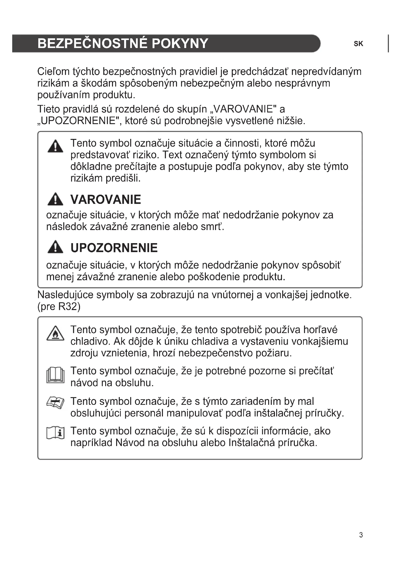 Cieľom týchto bezpečnostných pravidiel je predchádzať nepredvídaným rizikám a škodám spôsobeným nebezpečným alebo nesprávnym používaním produktu. Tieto pravidlá sú rozdelené do skupín „VAROVANIE" a „UPOZORNENIE", ktoré sú podrobnejšie vysvetlené nižšie. Tento symbol označuje situácie a činnosti, ktoré môžu predstavovať riziko. Text označený týmto symbolom si dôkladne prečítajte a postupuje podľa pokynov, aby ste týmto rizikám predišli. VAROVANIE označuje situácie, v ktorých môže mať nedodržanie pokynov za následok závažné zranenie alebo smrť. UPOZORNENIE označuje situácie, v ktorých môže nedodržanie pokynov spôsobiť menej závažné zranenie alebo poškodenie produktu. Nasledujúce symboly sa zobrazujú na vnútornej a vonkajšej jednotke. (pre R32) Tento symbol označuje, že tento spotrebič používa horľavé chladivo. Ak dôjde k úniku chladiva a vystaveniu vonkajšiemu zdroju vznietenia, hrozí nebezpečenstvo požiaru. Tento symbol označuje, že je potrebné pozorne si prečítať návod na obsluhu. Tento symbol označuje, že s týmto zariadením by mal obsluhujúci personál manipulovať podľa inštalačnej príručky. Tento symbol označuje, že sú k dispozícii informácie, ako napríklad Návod na obsluhu alebo Inštalačná príručka.4