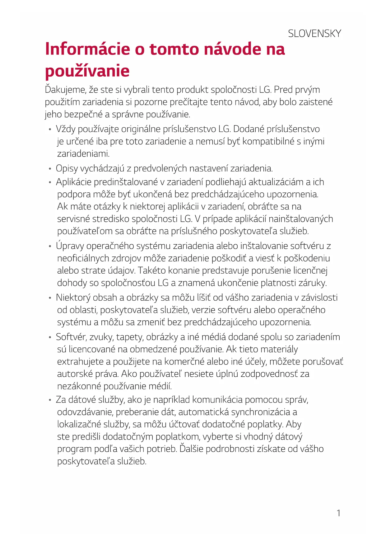 - Úpravy operačného systému zariadenia alebo inštalovanie softvéru z neoficiálnych zdrojov môže zariadenie poškodiť a viesť k poškodeniu alebo strate údajov. Takéto konanie predstavuje porušenie licenčnej dohody so spoločnosťou LG a znamená ukončenie platnosti záruky.