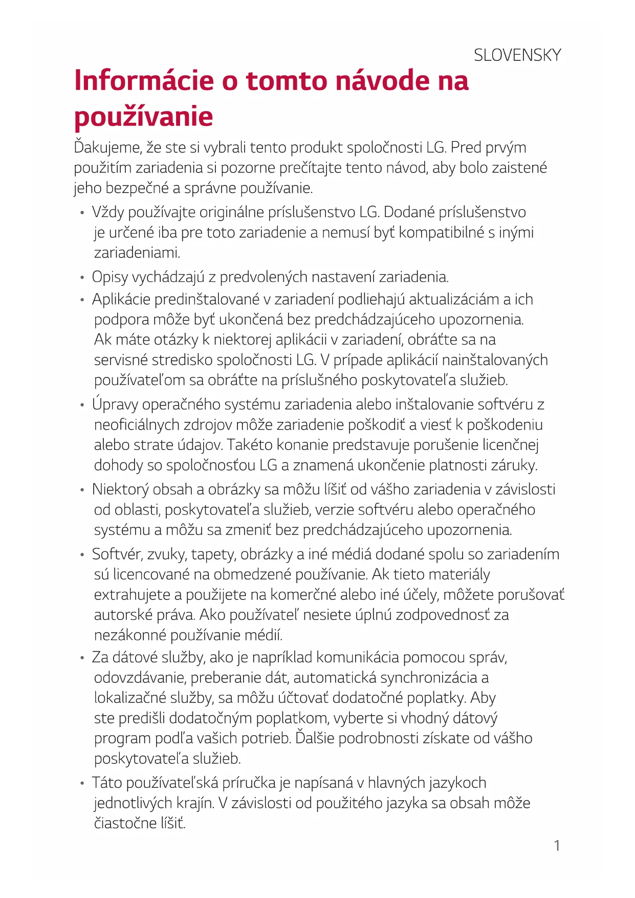 - Úpravy operačného systému zariadenia alebo inštalovanie softvéru z neoficiálnych zdrojov môže zariadenie poškodiť a viesť k poškodeniu alebo strate údajov. Takéto konanie predstavuje porušenie licenčnej dohody so spoločnosťou LG a znamená ukončenie platnosti záruky.