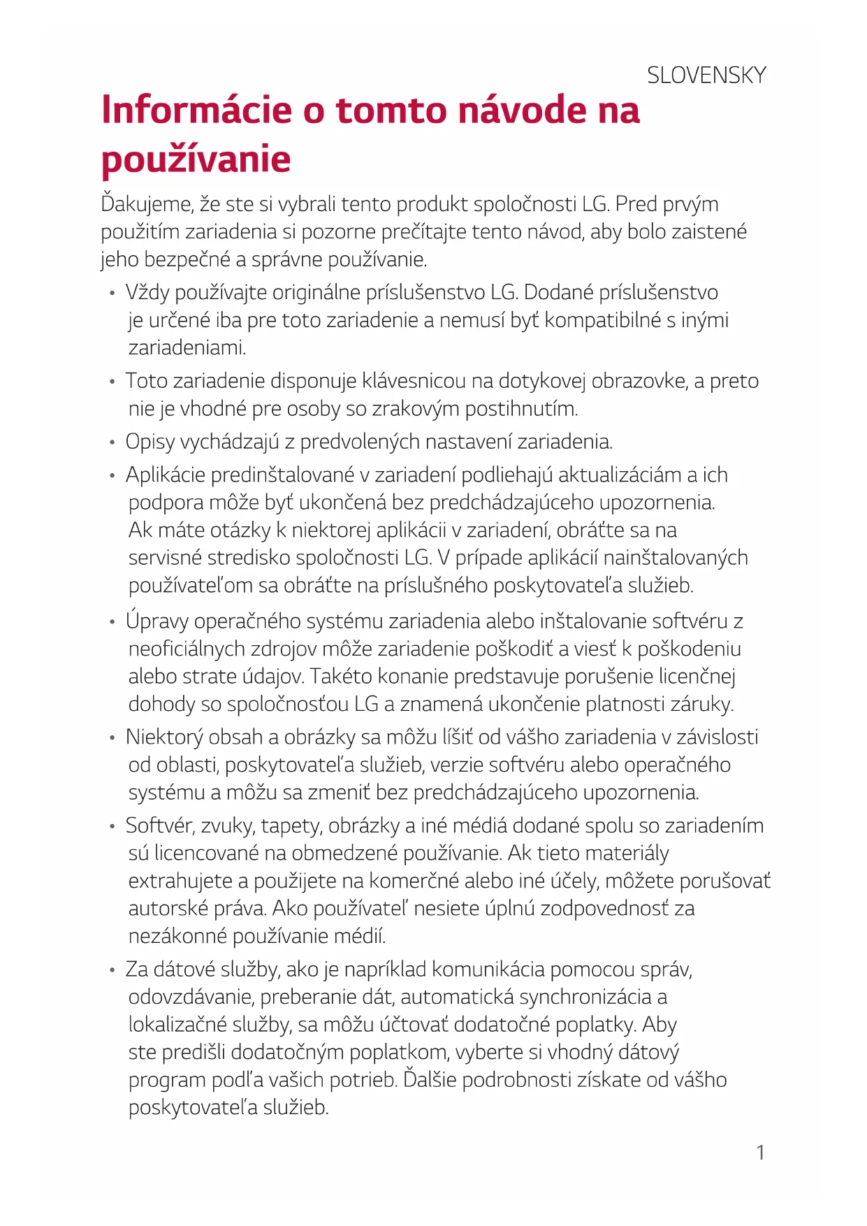 acumulatorilor dvs. vechi, vă rugăm să contactaţi consiliul local, serviciile de salubrizare sau magazinul de unde aţi achiziţionat produsul.1 Informácie o tomto návode na používanie Ďakujeme, že ste si vybrali tento produkt spoločnosti LG. Pred prvým použitím zariadenia si pozorne prečítajte tento návod, aby bolo zaistené jeho bezpečné a správne používanie.
