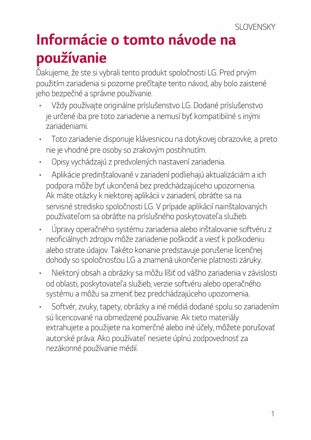 - Úpravyoperačnéhosystémuzariadeniaaleboinštalovaniesoftvéruz neoficiálnychzdrojovmôžezariadeniepoškodiťaviesťkpoškodeniu alebostrateúdajov.Takétokonaniepredstavujeporušenielicenčnej dohodysospoločnosťouLGaznamenáukončenieplatnostizáruky.