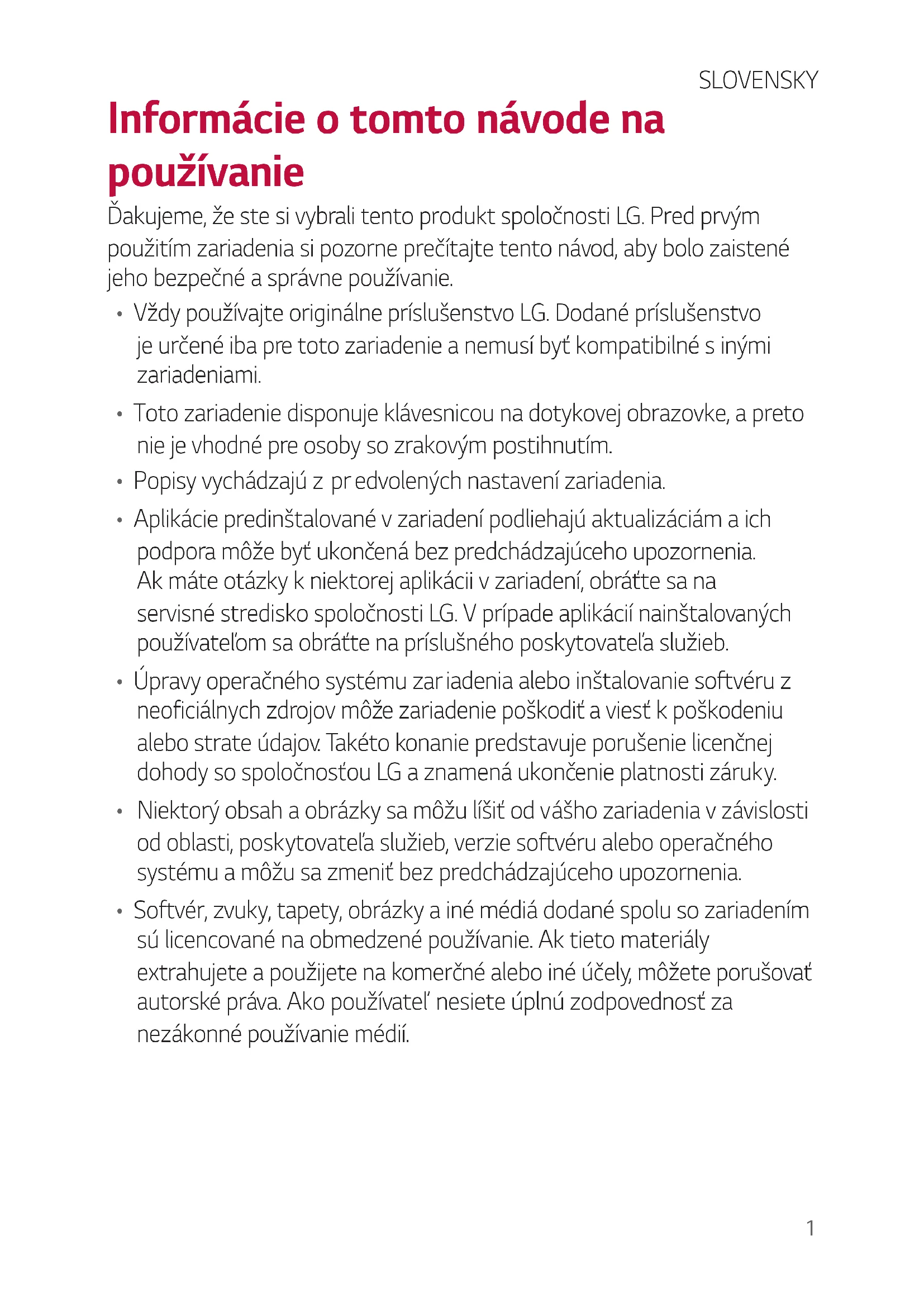 acumulatorilor dvs. vechi, vă rugăm să contactaţi consiliul local, serviciile de salubrizare sau magazinul de unde aţi achiziţionat produsul.1 Informácie o tomto návode na používanie Ďakujeme, že ste si vybrali tento produkt spoločnosti LG. Pred prvým použitím zariadenia si pozorne prečítajte tento návod, aby bolo zaistené jeho bezpečné a správne používanie.