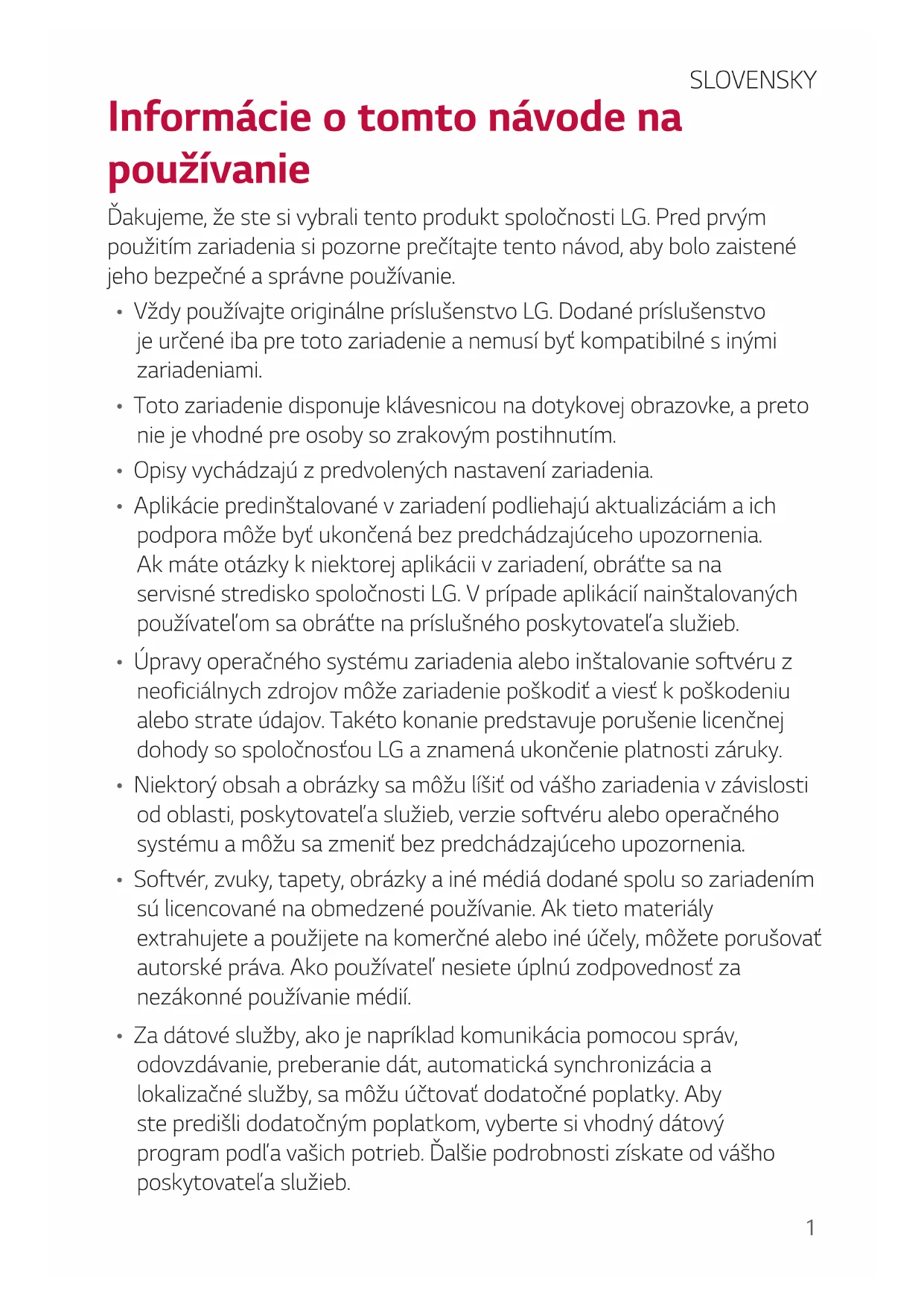 - Úpravy operačného systému zariadenia alebo inštalovanie softvéru z neoficiálnych zdrojov môže zariadenie poškodiť a viesť k poškodeniu alebo strate údajov. Takéto konanie predstavuje porušenie licenčnej dohody so spoločnosťou LG a znamená ukončenie platnosti záruky.